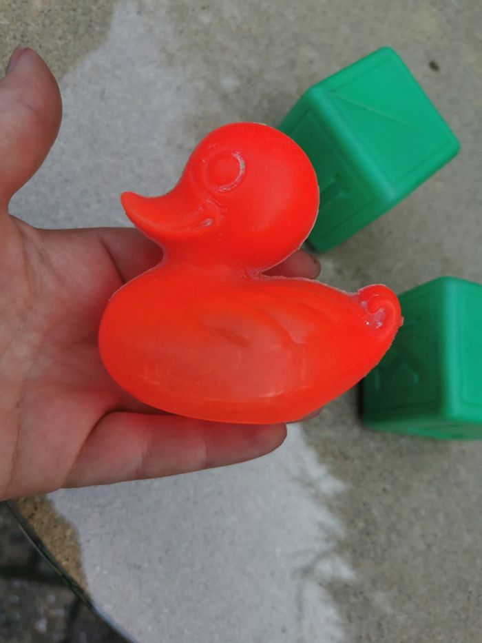 Lot de jouets en plastique canard rouge et deux cubes verts avec des lettres - photo numéro 4