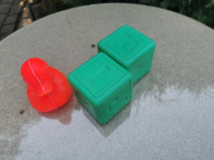 Lot de jouets en plastique canard rouge et deux cubes verts avec des lettres - photo numéro 1