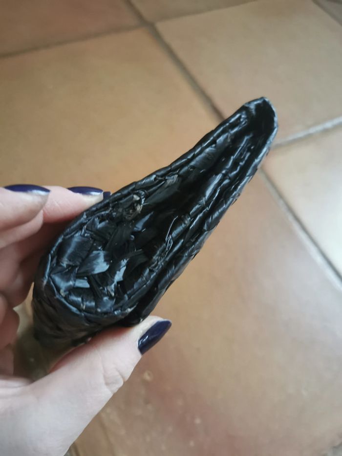 Pochette noire en paille, fabriquée en Italie pour Galeries Lafayette, pochette vintage en très bon état. L'intérieur est satiné avec une petite poche, la pochette se ferme par un bouton type macramé, la pochette est en très bon état général, mais a quelques marques au dos et sur le contour. Mesures : Hauteur : 14 cm Largeur : 3,5 cm Longueur : 24 cm Poids : 158g #pochettenoireenpaille #pochettenoire #pochettedesoiree