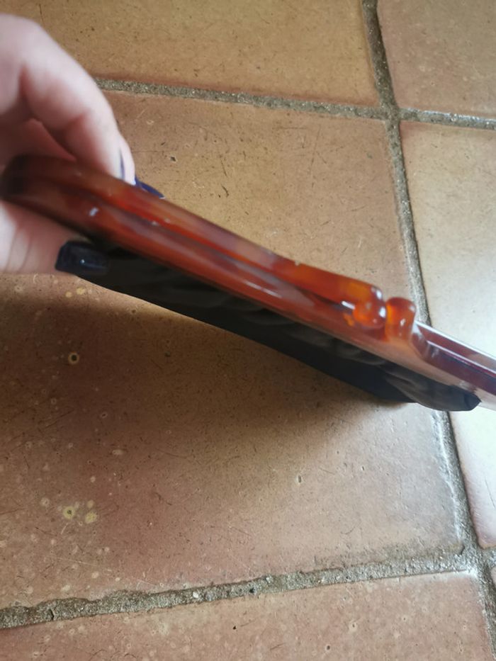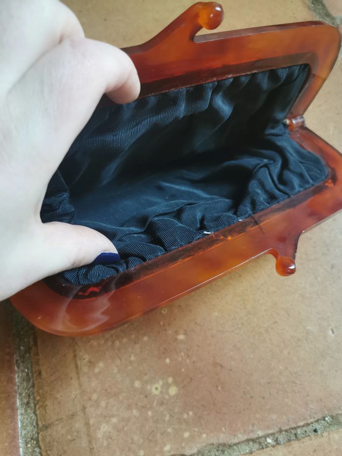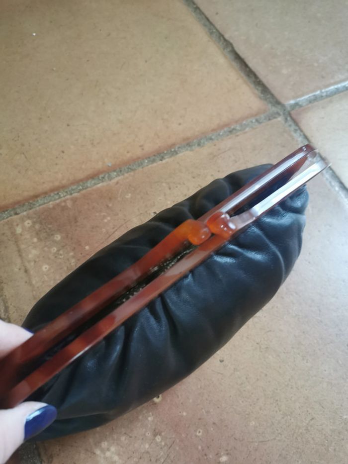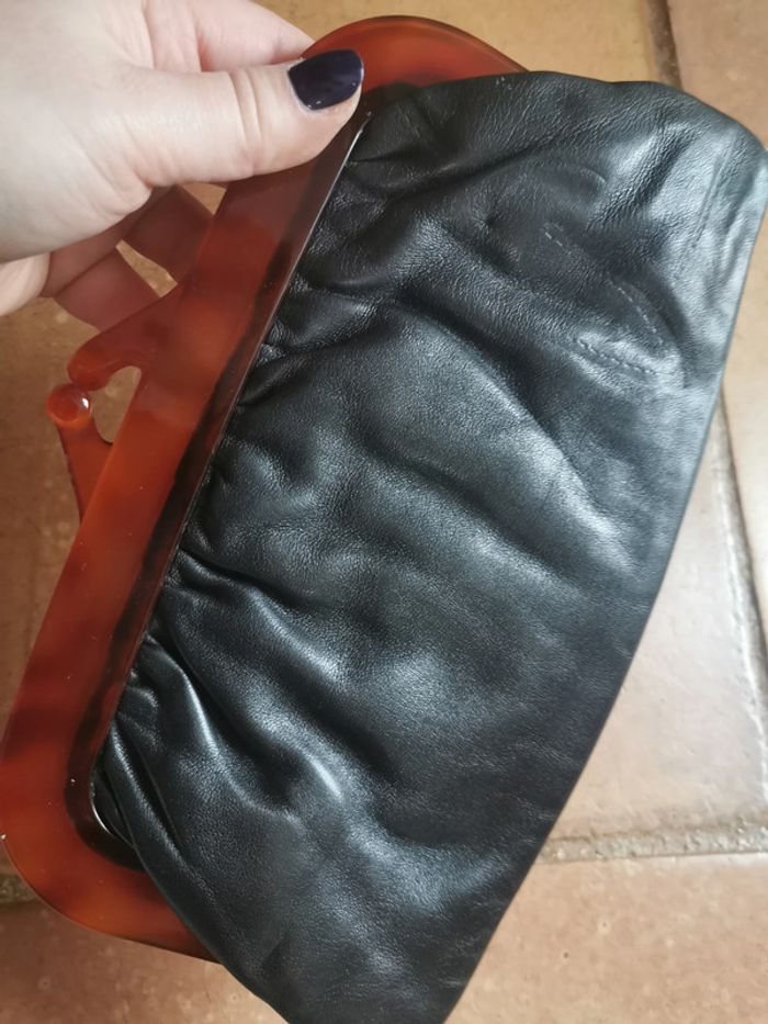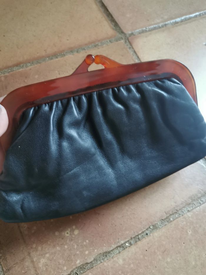 Pochette clutch en simili cuir ou cuir noir, l'intérieur est en tissu noir avec une petite poche, le fermoir est marron en plastique rigide, fermoir type porte-monnaie. Belle pochette vintage des années 60/70, made in France. Comporte des traces d'utilisation extérieur, notamment sur le plastqiue, si non en très bon état, compte tenu son ancienneté. Dimensions : Hauteur : 16,5 cm Largreur : 23-26 cm Poids : 180g #pochettevintage #pochetteportemonnaie #pochetteanicenne #pochetteclutch