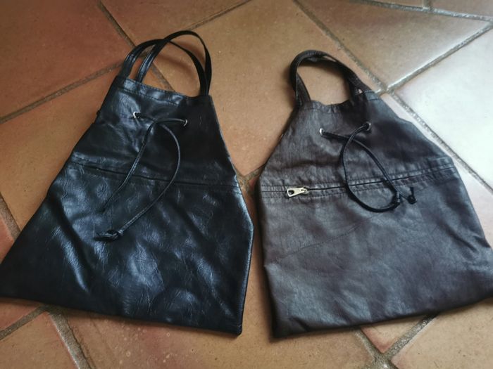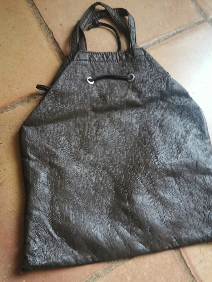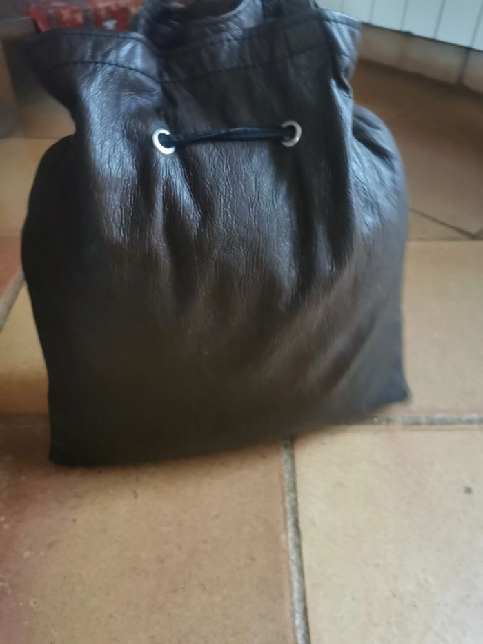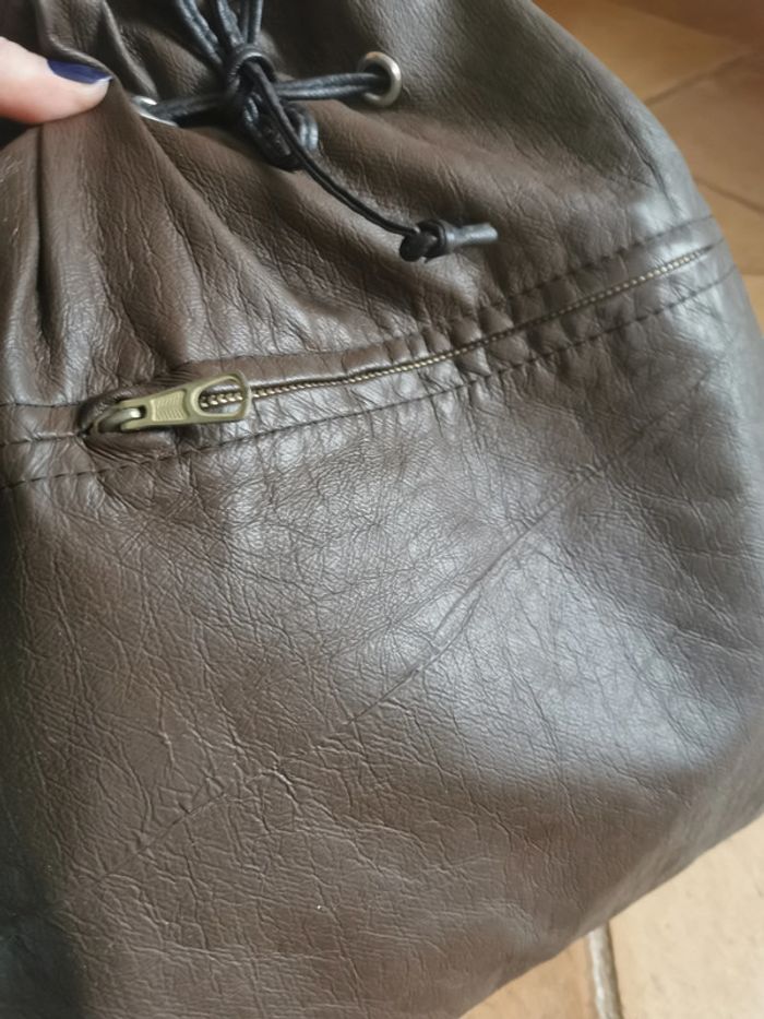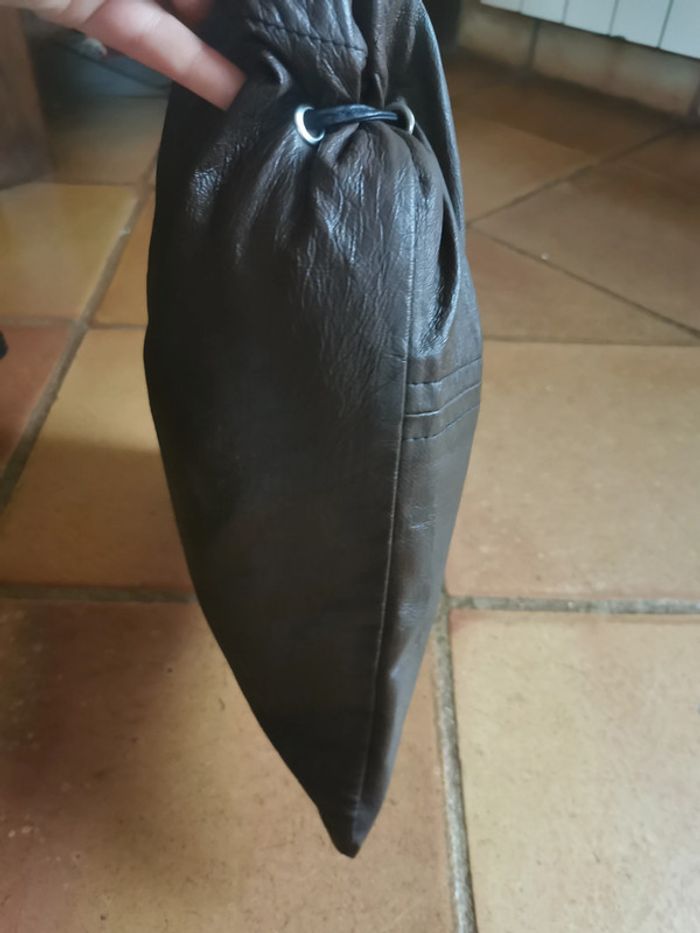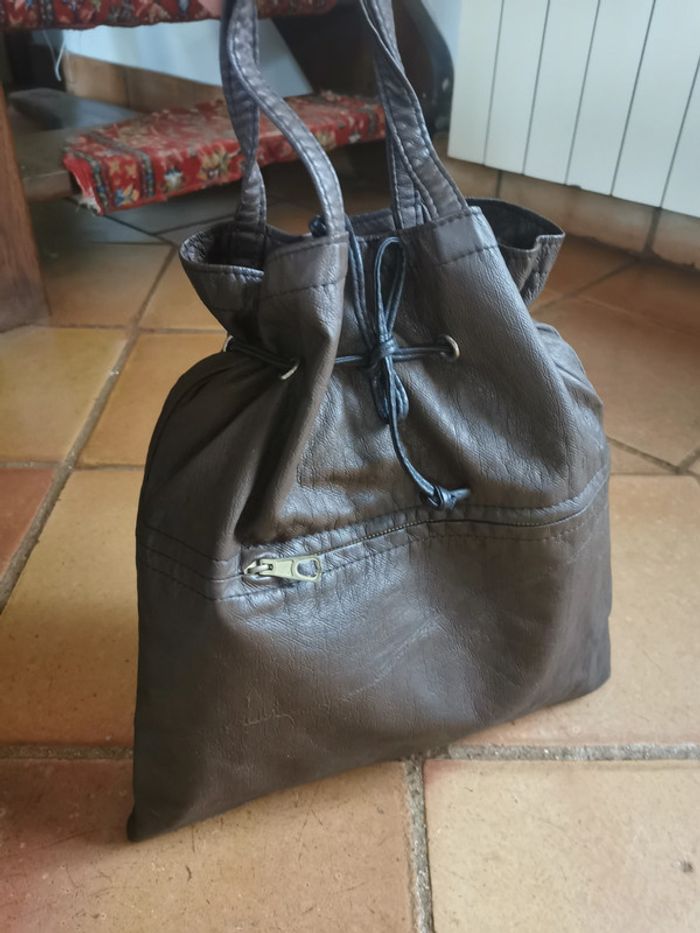 Sac pochette marron vintage à oeillets en simili cuir, fermeture à 6 oeillets et une corde en simili-cuir également, la poche à zip devant, l'intérieur est en tissu, la poche est en tissu renforcé, deux poignées. J'ai une deuxième pochette dans le même style, mais de couleur noir, également en vente sur ma page. Devant une sorte de rayure/pliure dans le matériau d'origine. Dimensions : Hauteur : 35,5 cm Largeur : 33 cm Poids : 160g #sacvintage #sacpochettemarron #pochettemarron #pochettevintage #sacsimilicuir