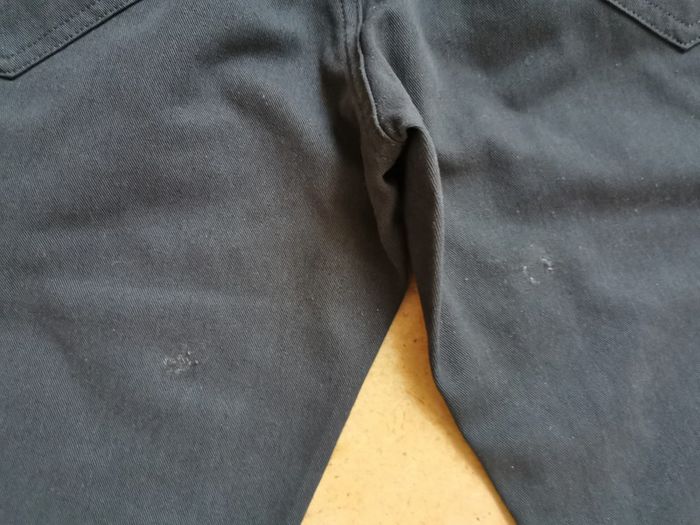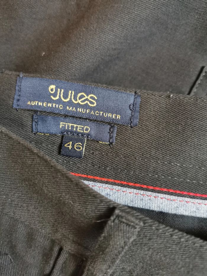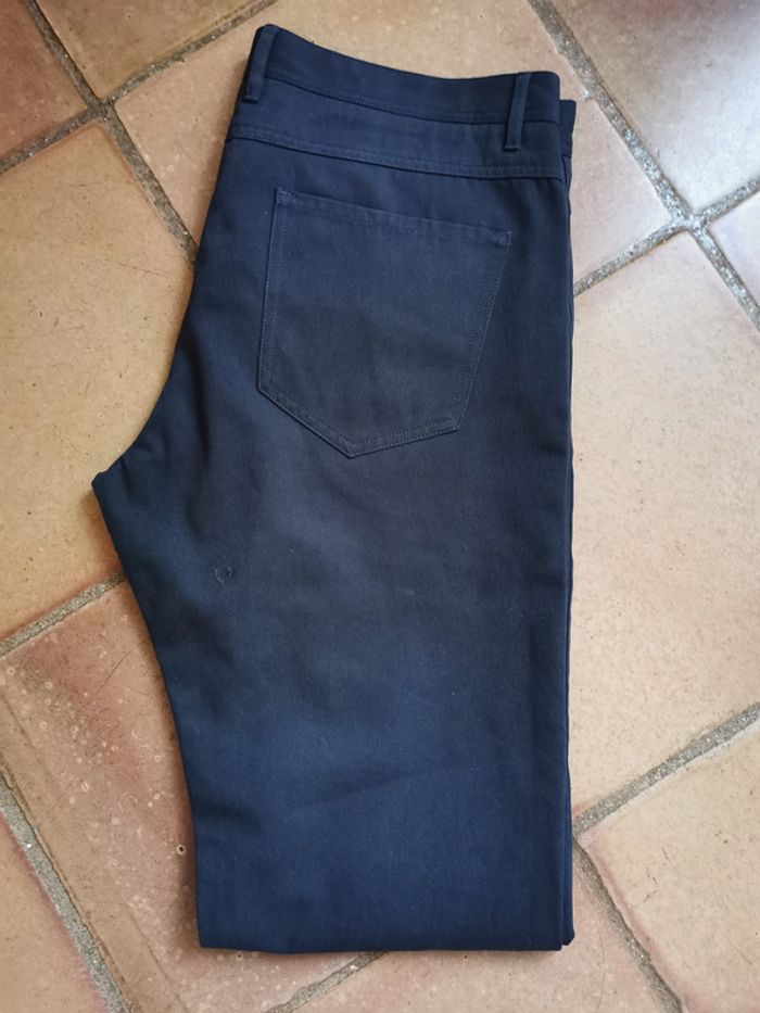 Pantalon droit type jeans fin noir pour homme, taille 46, marque Jules, coupe fitted, composition : 64% polyester, 36% coton, en très bon état, très peu porté, a deux traces blanche aux fesses (je pense que c'est dans la matière, les fils qui sont sortis). Mesures : Longueur depusi la taille : 109,5 cm Longueur depuis l'entre-jambe : 84,5 cm Hauteur devant : 26 cm Hauteur dos : 35 cm Largeur taille : 48 cm Largeur hanches : 56 cm Largeur cuisse : 26,5 cm largeur mollet : 22,5 cm Largeur cheville : 21 cm Poids : 450g #pantalonhomme #pantalonjean #pantalonnoir #pantalontaille46 #pantalonjules #pantalondroit