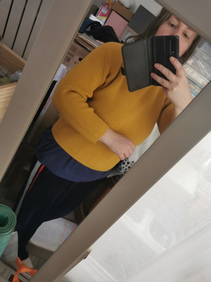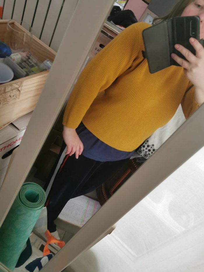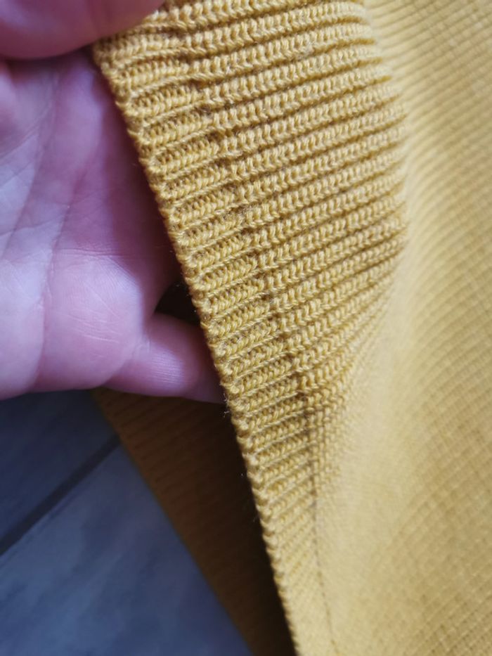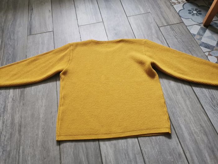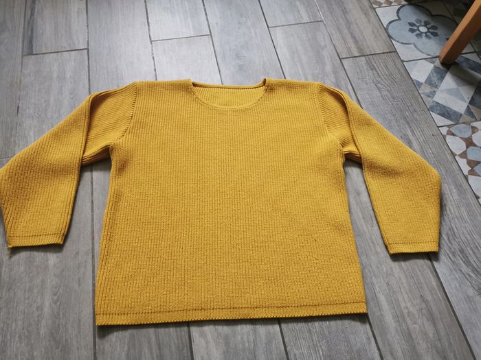 Pull type crop top, couleur moutarde, en maille, manches semi-longues. Il est assez épais, je pense en acrylique, il n'y a aucune étiquette, probablement taille 36, voir les mesures ci-dessous. Mesures : Longueur : 58 cm Longueur manche : 49 cm Longueur manche depuis l'aisselle : 40 cm Largeur dos : 44 cm Largeur entre les aisselles : 56 cm Poids : 455g #pullmoutarde #pullejaune #pullcrop #croptop #pullmaille