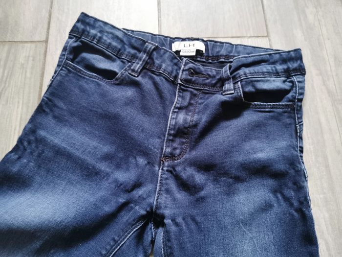 1 jean bleu marine, marque LH, jeans élastique en bon état général, marques à l'entre-jambes. Mesures : longueur depuis la taille : 85cm, longueur depuis l'entre-jambe : 66,5cm, largeur taille : 30cm, hauteur l'entre -jambe devant : 19cm, hauteur l'entre-jambe derrière : 25 cm, largeur hanche : 34 cm, largeur jambe : 17 cm.