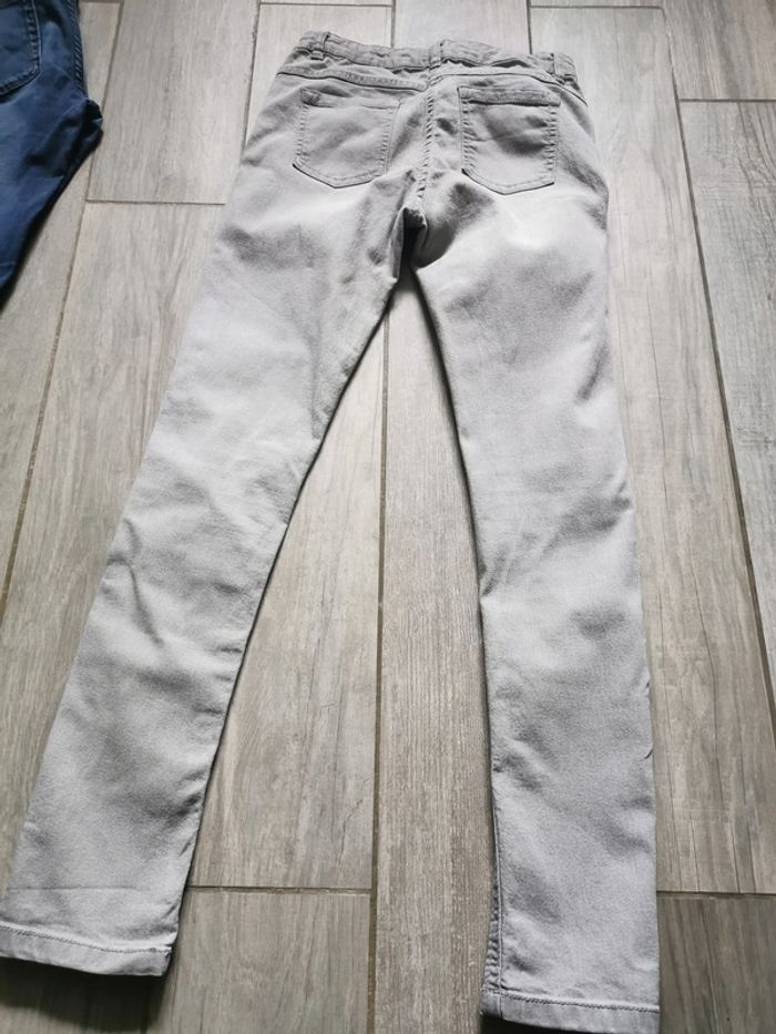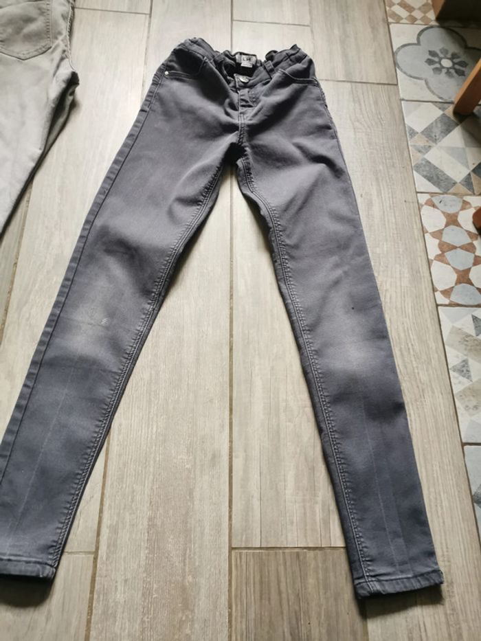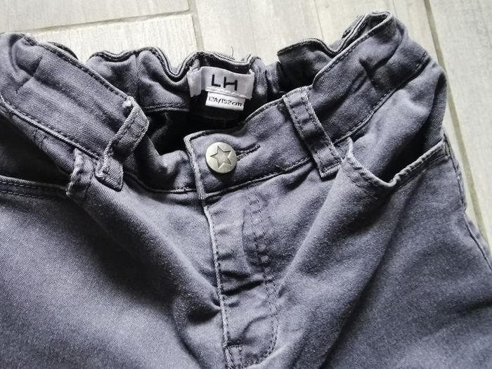 1 jeans gris, marque LH, taille élastiquée réglable, s'étire, en très bon état, une petite tache sur le genou, mesures : longueur depuis la taille : 85cm, longueur depuis l'entre-jambe : 67cm, largeur taille : 29 cm, hauteur l'entre -jambe devant : 19cm, hauteur l'entre-jambe derrière : 25 cm, largeur hanche : 34 cm, largeur jambe : 17 cm.