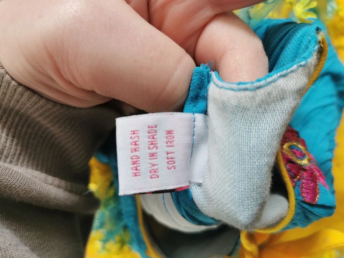 belle petite robe jaune et bleu avec les fleurs en ruban, des paillettes, pour 4-5 ans (voir les mesures ci dessous, car il n'y a pas d'étiquette), marque Nabi20, lavage à la main uniquement. Elle est très jolie et comme neuve, avec les manches courtes et la jupe évasée, au dos fermeture éclair. Mesures : Longueur : 50 cm Largeur dos : 28 cm Largeur taille : 26 cm Poids : 170g #robejaune #robefille #robe4ans #robefete5ans #robejauneetbleu #robefleurs