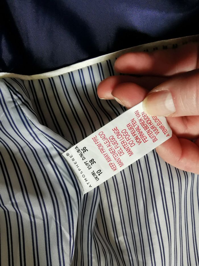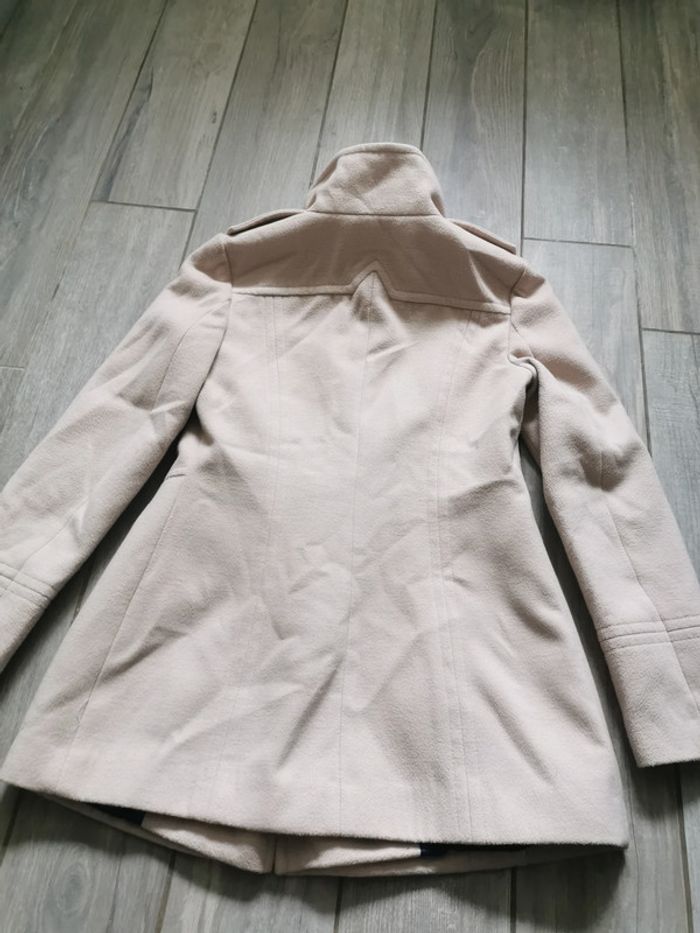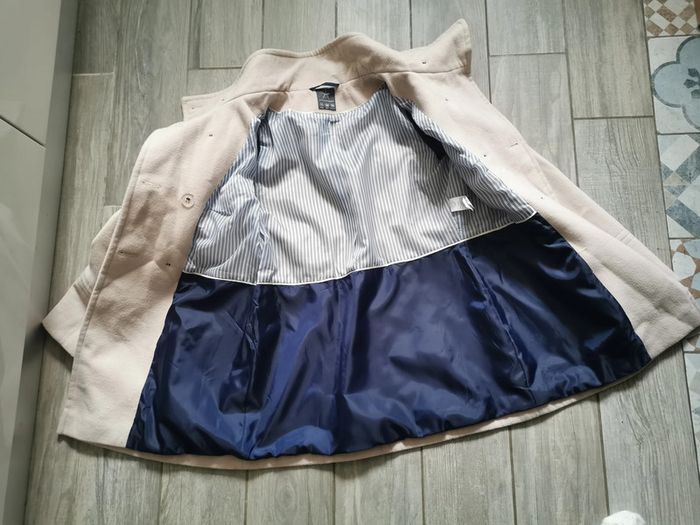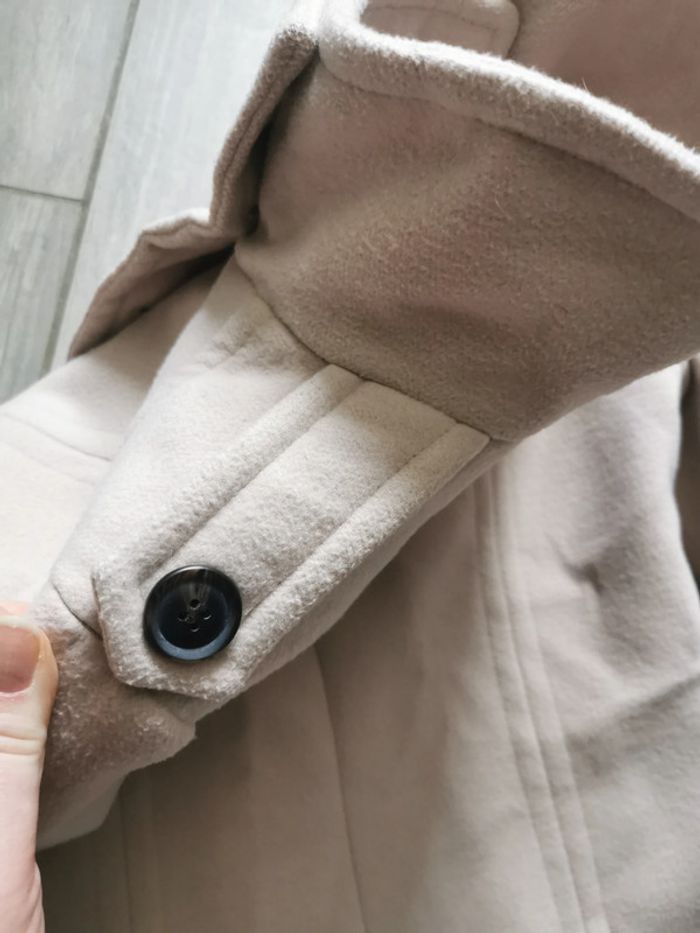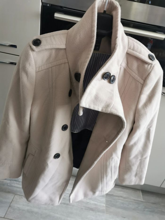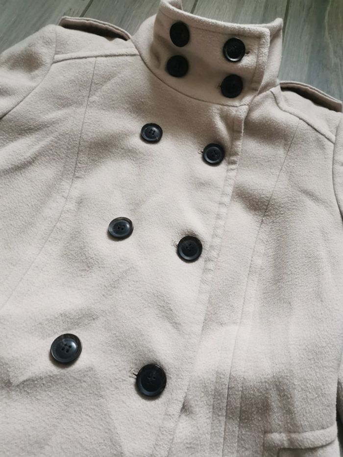 Manteau beige, marque Atmosphère, taille 36/38, composition 84% polyester, 14% viscose, 2% elasthanne; doublure 100% polyester. Le Manteau droit, avec le col montant ferméture à boutons, deux poches latérales, en très bon état, un peu froissé.