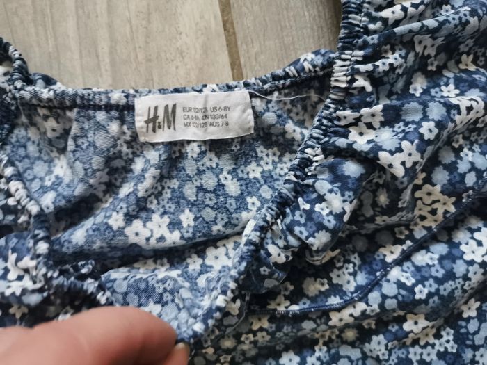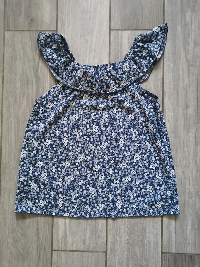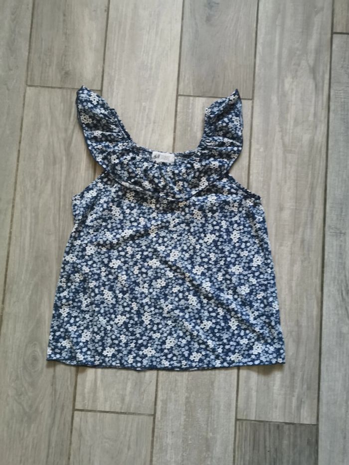 Joli petit haut sans manches, décolleté à volants, bleu à fleurs blanches, pour 6-8 ans, 122-128 cm, marque H&M, composition 100% polyester. Poids 66g, en très bon état. #hautsansmanches #hautbleu #hautavolants #hautfille6ans #hautfille8ans