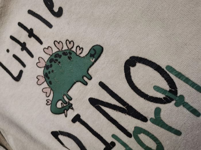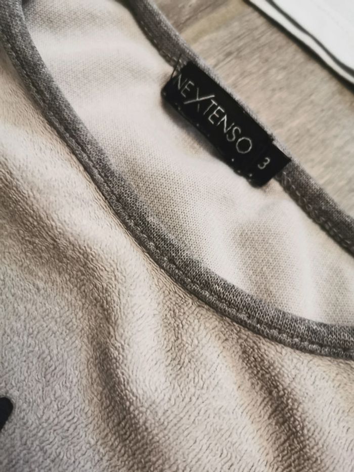 5. Haut de pyjama gris clair avec inscription Little Dino Dort! , à manches longues, le motif devant à craquelé, marque In Extenso, bon état général, tissu coton éponge.