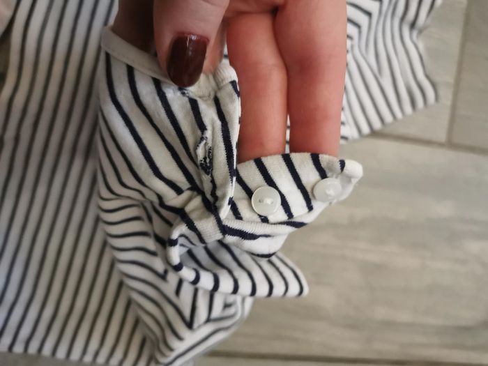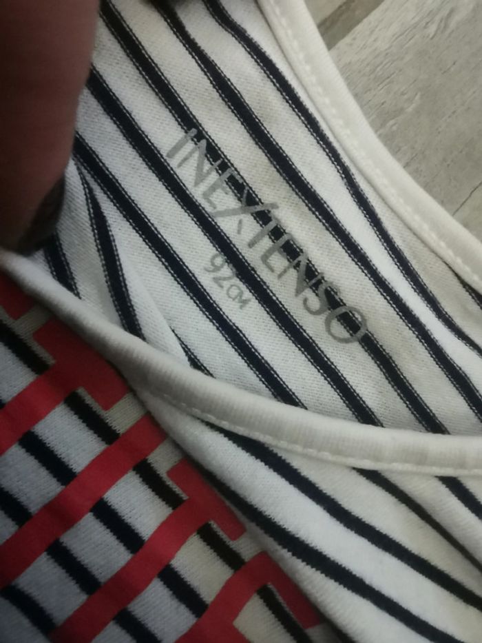 1. Tee shirt à rayures avec l'inscription Petite Madame Parfaite, pour 92 cm, marque In Extenso. T-shirt à manches courtes avec les boutons sur une épaule, 100% coton. en très bon état.