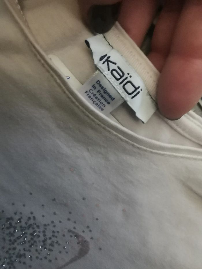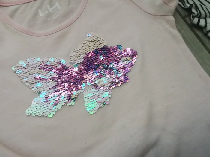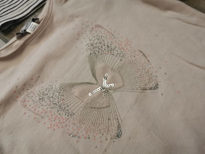 4. T-shirt rose clair avec papillon à strass devant, à manches longues, marque Okaidi, pour 98 cm, coton/élasthanne, en très bon état.