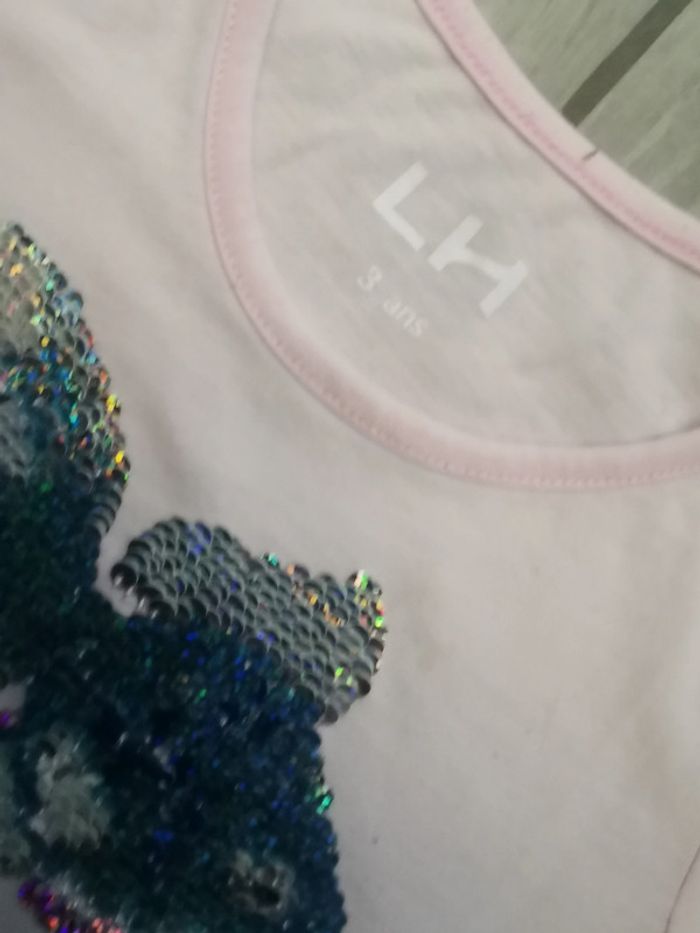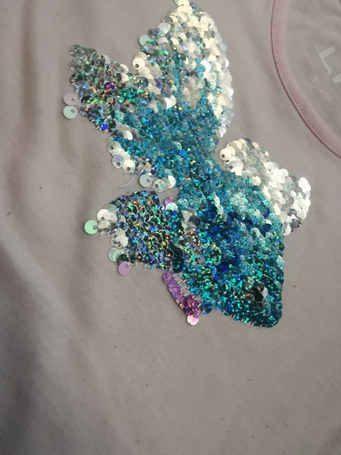 2. T-shirt rose avec le poisson écailles changeant de couleur , manches courtes, marque LH, composition : 60% coton, 40% polyester, bon état général, peluché.