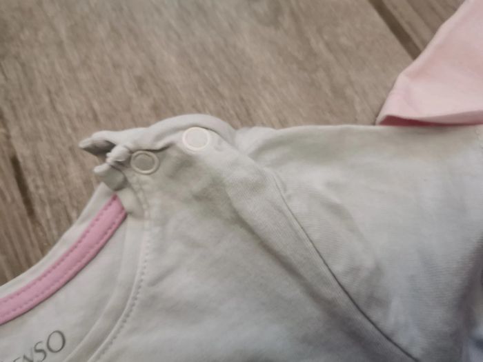 3. T-shirt manches courtes, gris clair avec les flamands roses, pour 92 cm, marque In Extenso, en coton, très bon état, sur une épaule boutons pression.