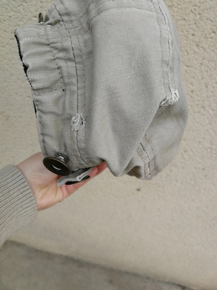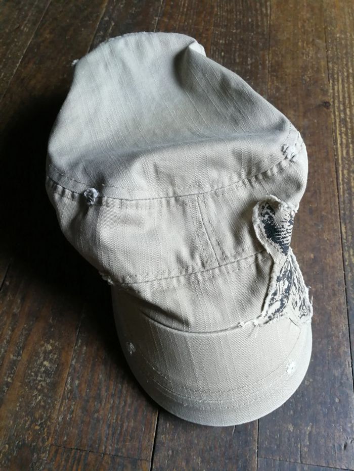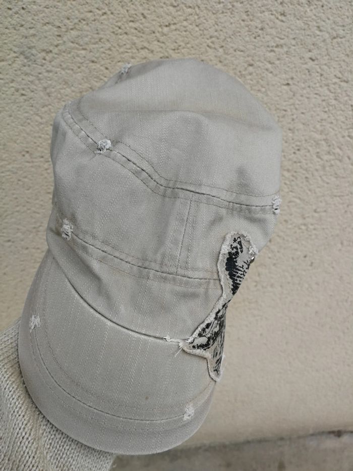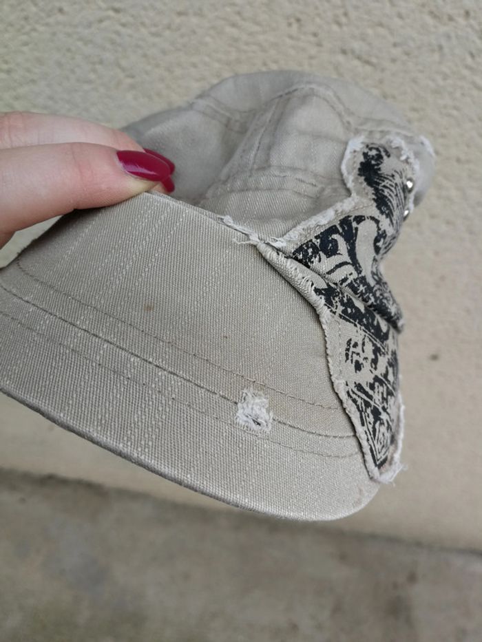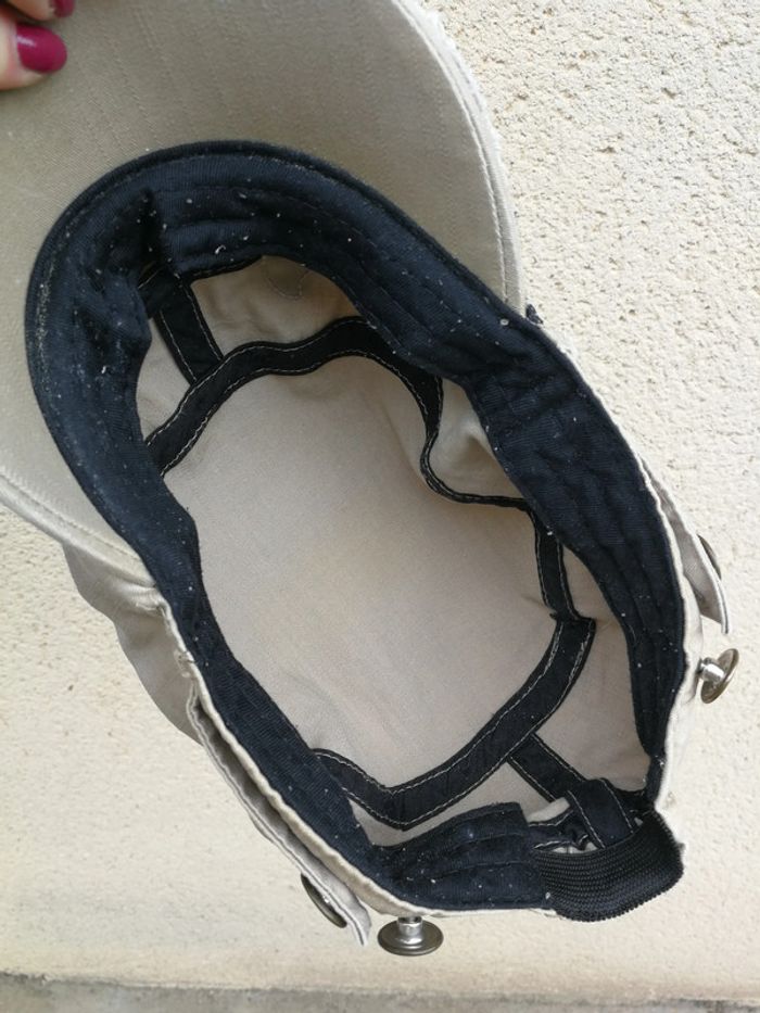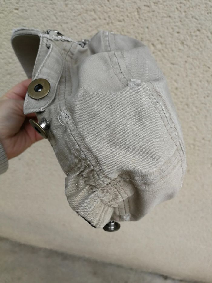 Jolie casquette effet trouée avec deux boutons de chaque côté et élastique à la nuque afin de pouvoir changer de taille. En bon état général, quelques taches devant. Mesures : Hauteur : 7 cm Taille plus grande : 55 Poids : 85 g #casquettetrouée #casquettebeige #casquettecoton