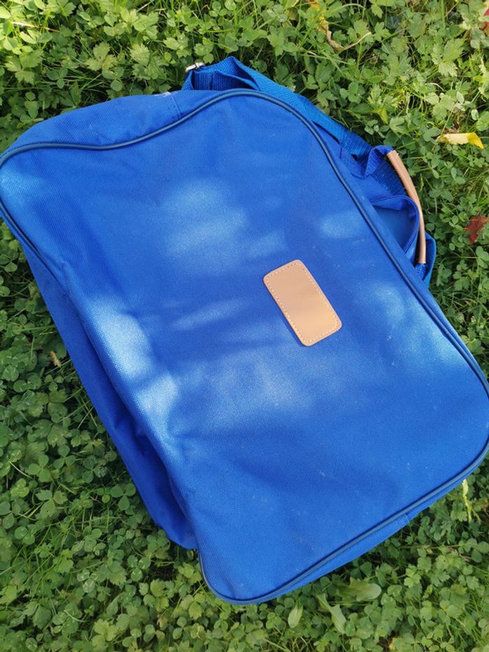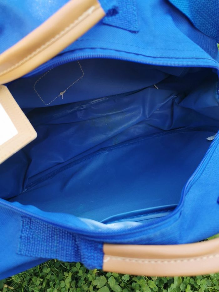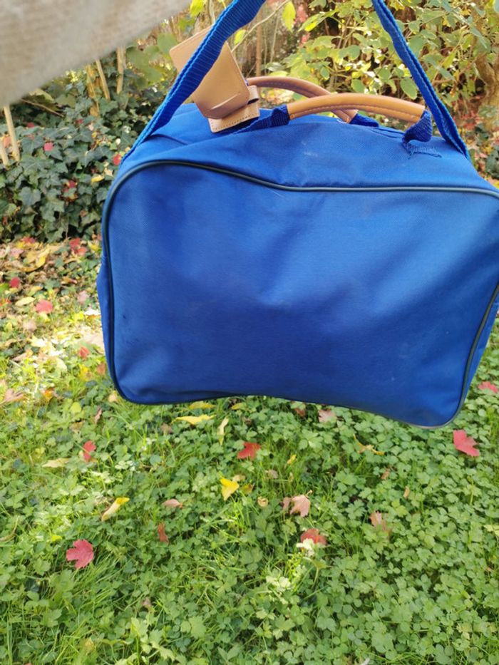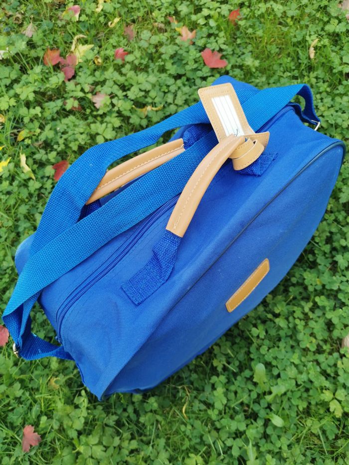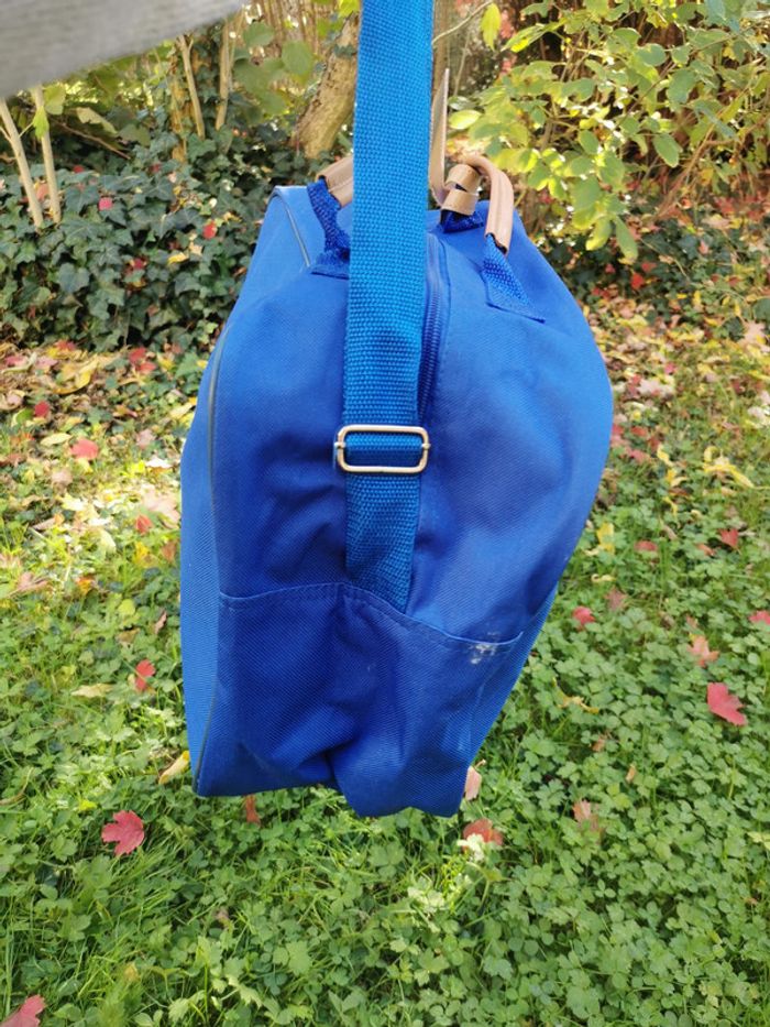 Sacoche bleu fourre tout, en très bon état, avec une mabdoulière, deux poignées marron en similicuir et une étiquette d'adresse. Dimensions : Hauteur : 27 cm Longueur : 34,5 cm Epaisseur : 14 cm Poids : 250 g #sacochebleu #sacocheforretout