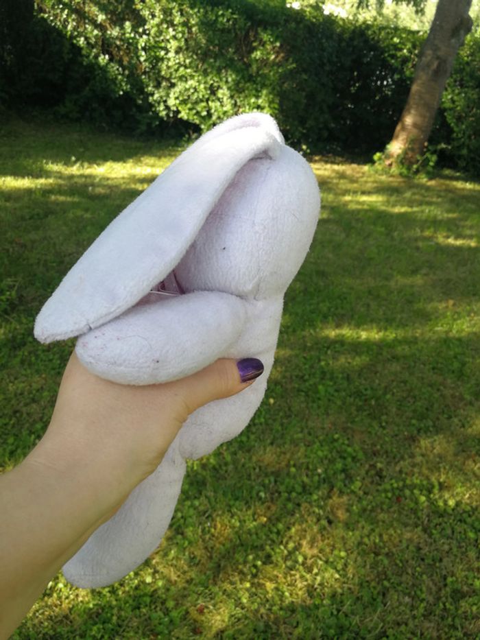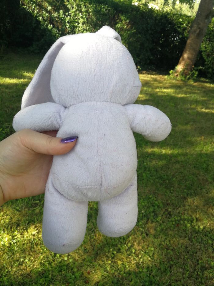 Peluche doudou lapin mauve avec le ruban en noeud papillon devant, les yeux sont brodés, bon état général, présente des peluches au niveau de la tête et les lettres du prénom devant, sa taille fait 26 cm et son poids 90 g #peluchelapin #lapinpeluche #peluchemauve #lapinmauve #pelucheyeuxbrodes