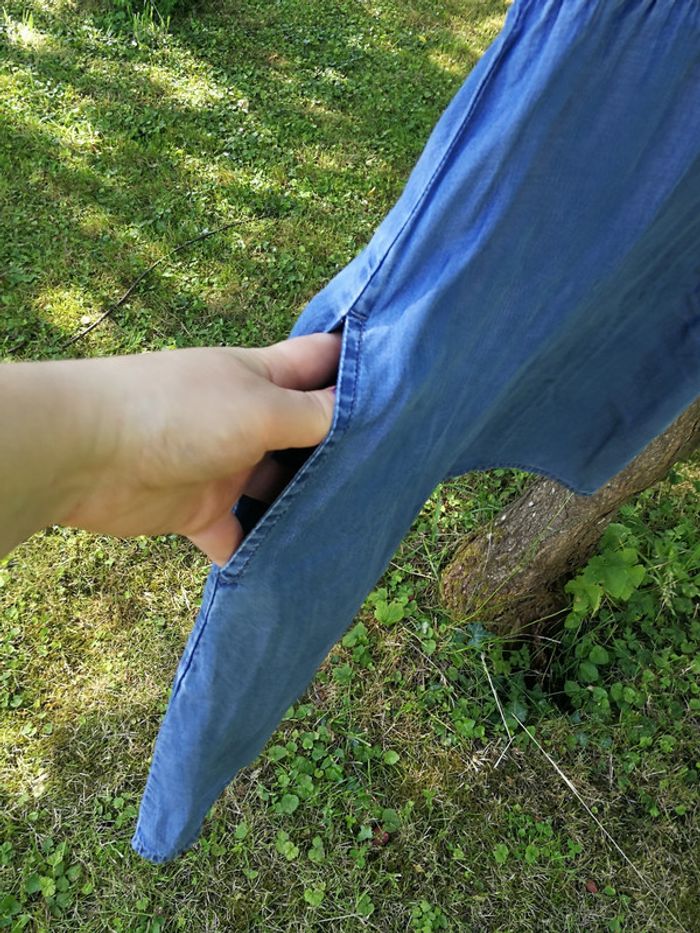 Robe en lyocel bleu, boutonée devant, deux poches sur les côtés, cintrée à la taille (taille haute) et évasée aux hanches, robe sans manches, de taille 36, col type chemisier. Robe de chez C&A, en bon état, le couleur est un peu partie par endroit. Mesures : Longueur : 89 cm Largeur de taille (à plat) : 40 cm Largeur du dos : 44 cm Largeur de jupe aux hanches ( à plat) : 60 cm Poids : 174 g #robebleu #robelyocel #robecintrée #robeévasée #robec&a