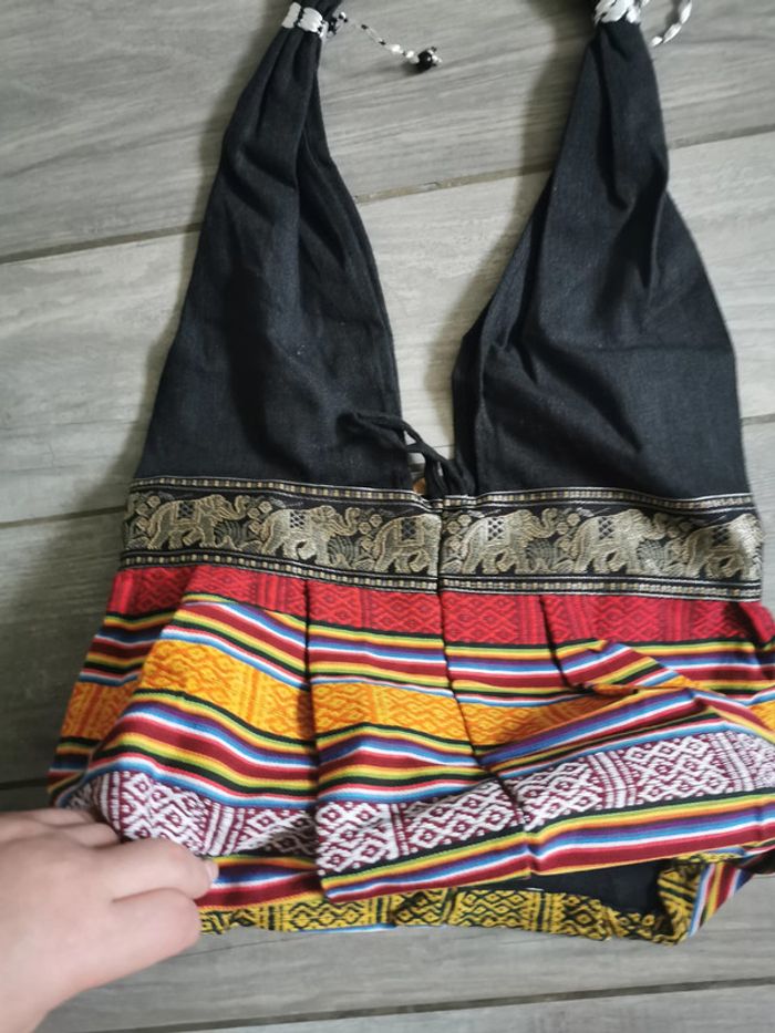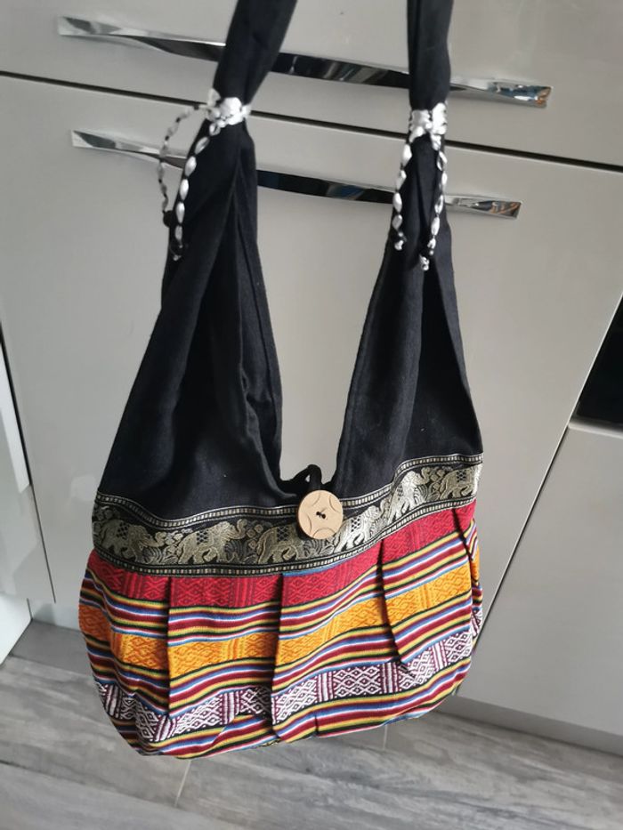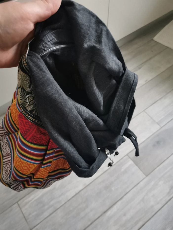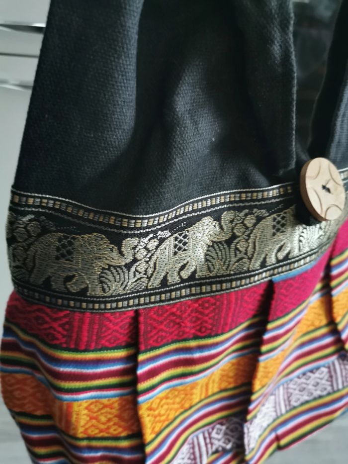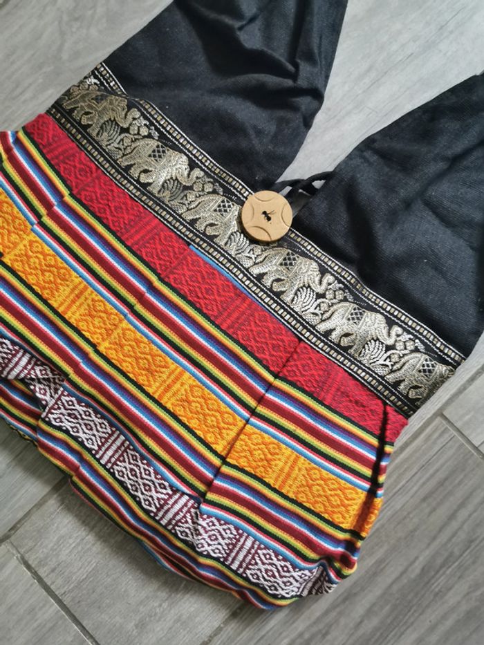 Sac baluchon en coton indien aux motifs éléphants, le gros bouton en bois pour fermer le sac, avec une poignée, joli sac neuf sans étiquette dans les couleurs traditionnelles de l'Inde. Joli accessoire éthnique e coton, brodé. Mesures : Longueur poignée : 80 cm Largeur du sac : 34 cm Profondeur : 15 cm Poids : 200 g #sacindien #sacindou #sactraditionnel #sacethnique #sacbaluchon