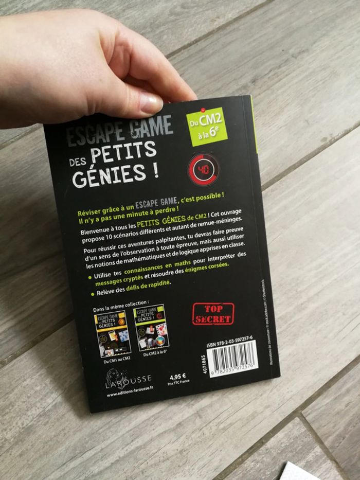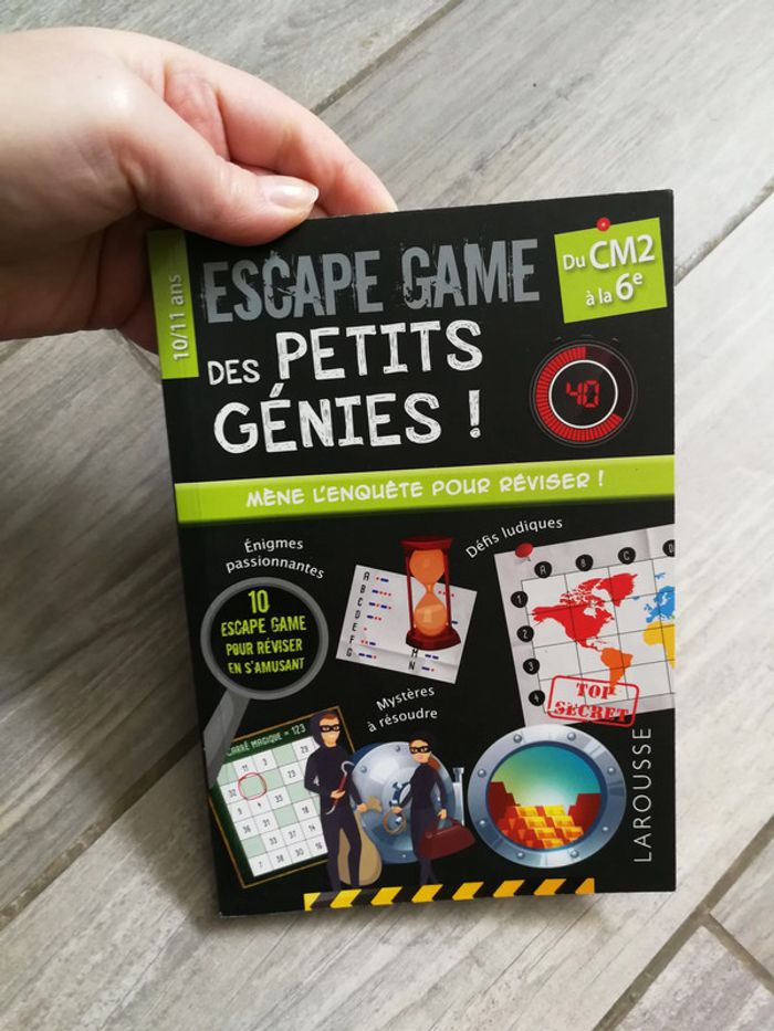 Escape Game des petits génies ! 10/11 ans, du CM2 à la 6e, mène l'enquête pour réviser ! Editions Larousse, Mallory Monhard, professeur des écoles, 2019, 79 p., 171 g. Le livre est neuf, juste à la page 74-75 coup de stylo rouge (voir les photos). #escapegameenfant #escapegameeducatif #jeucm2 #cahierderevisions
