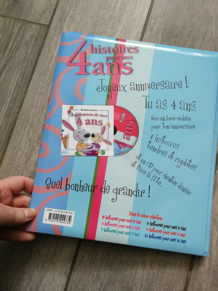 Mes histoires d'anniversaire, 4 histoires pour mes 4 ans, éditions Fleurus, 2004, 47 p., poids 531g, SANS CD, le livre dans la couverture rigide, en très bon état, a juste une tache à l'intérieur de la couverture. #4ans #livre4ans #anniversaire #livreanniversaire