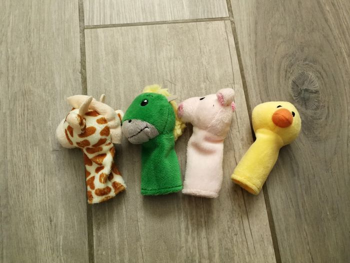 Peluches marionnettes animaux de doigts : cochon, dinosaure, giraffe et poussin, sont très douces et en très bon état, pour les petits doigts. Dimensions : Longueur total : 8 cm Longueur doigt : 5 cm Tour du doigt : 7 cm Poids : 21 g #pelucheanimaux #peluchedoigts #peluchesmarionnettes #marionnettesdedoigts