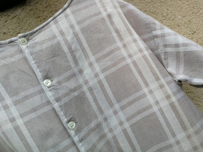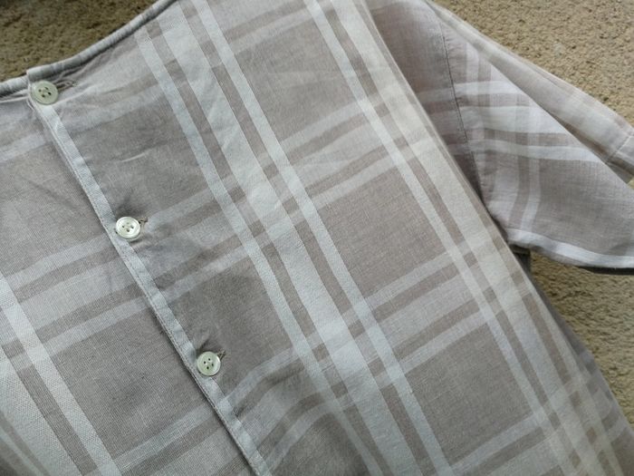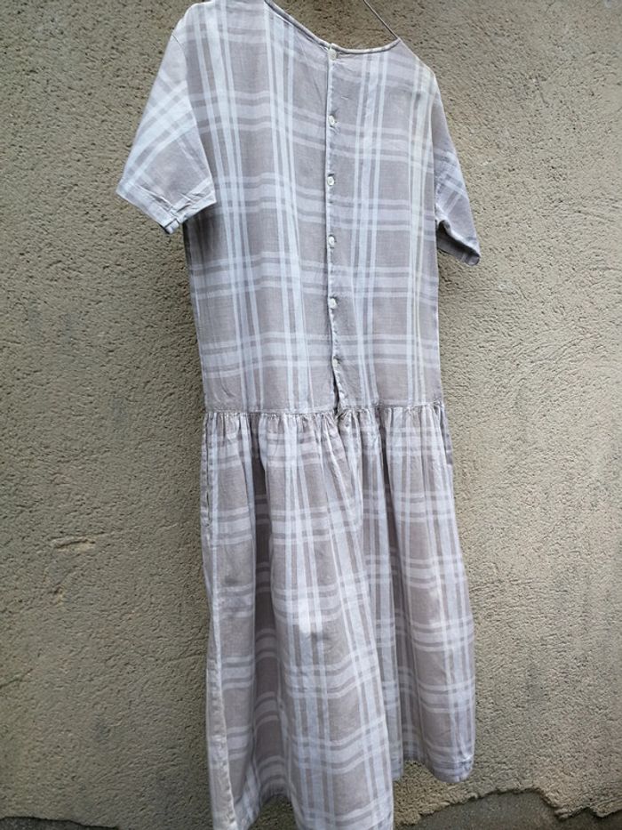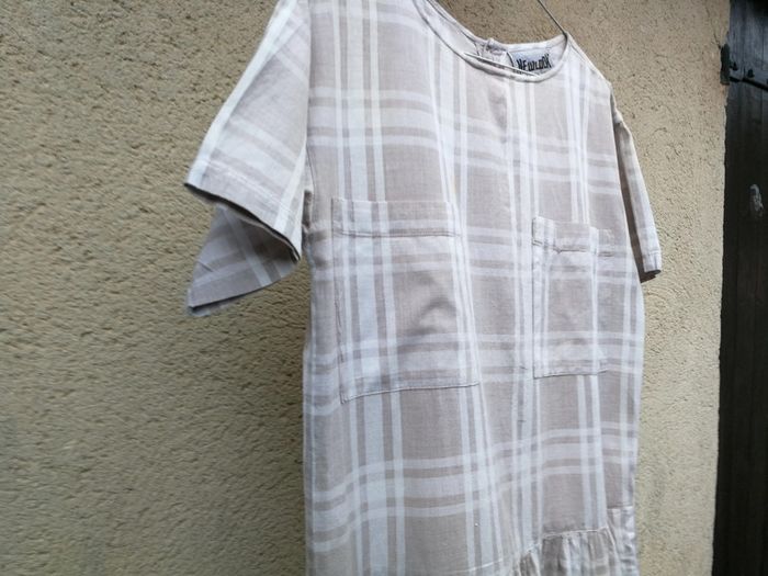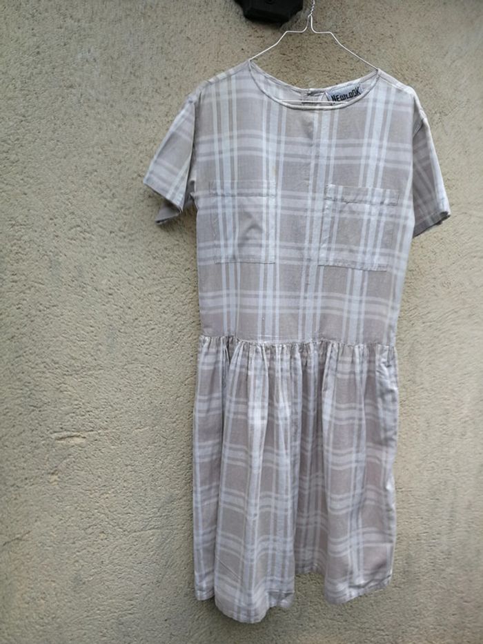 Robe longue d'été à carreaux New Look, fabriquée en Inde, 100% coton, vintage, je pense que c'est la taille 40, consultez quand même les mesures données ci dessous. La robe à manches courtes, taille basse, évasée en bas, deux poches sur lapoitrine, col rond, deux poches latérales, dos boutonné. Bon état général, a quelques taches jaunes devant (pas très visibles, sauf celle sur la poche de poitrine) Mesures : Longueur : 108 cm Longueur manche depuis l'aisselle : 14 cm Largeur à plat poitrine : 48 cm Poids : 250 g #robeacarreaux #robecoton #robedete #robelongue #robevintage