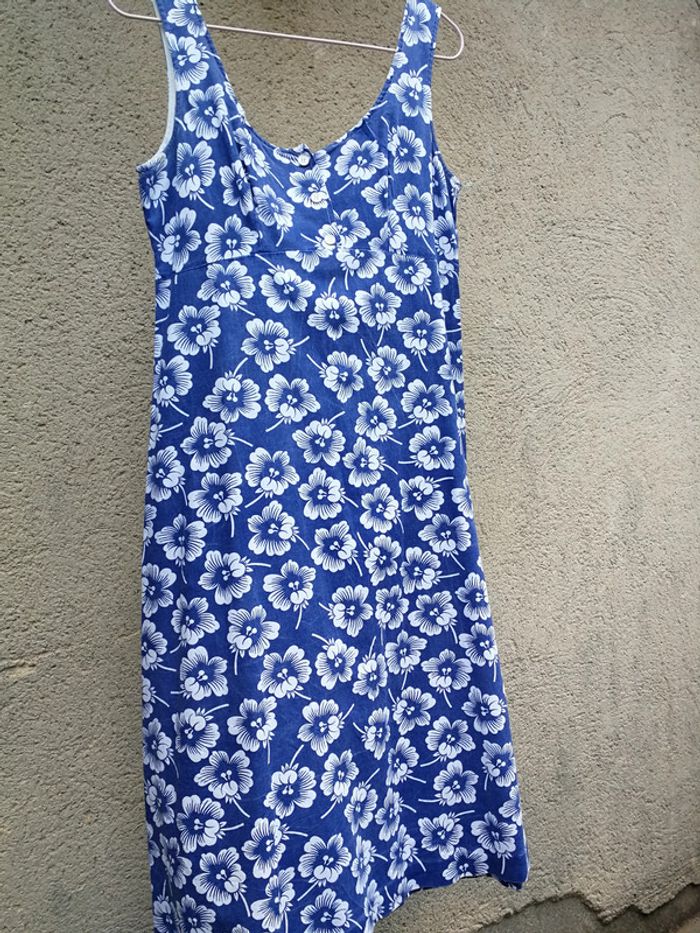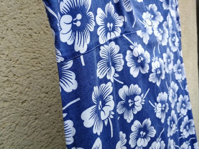 Robe d'été longue bleu motif floral sans manches, iitation boutons devant, au dos zip, légèrement évasée, je pense que c'est la taille 36/38, il n'y a aucune étiquette, consultez les mesures ci dessous. La robe est en coton, en très bon état, a un peu perdu de sa couleur. Mesures : Longueur : 83 cm Tour sous la poitrine : 76 cm Tour de taille : 80 cm Poids : 173 g #robedete #robebleu #robecoton #robesansmanches #robefleurs #robelongue