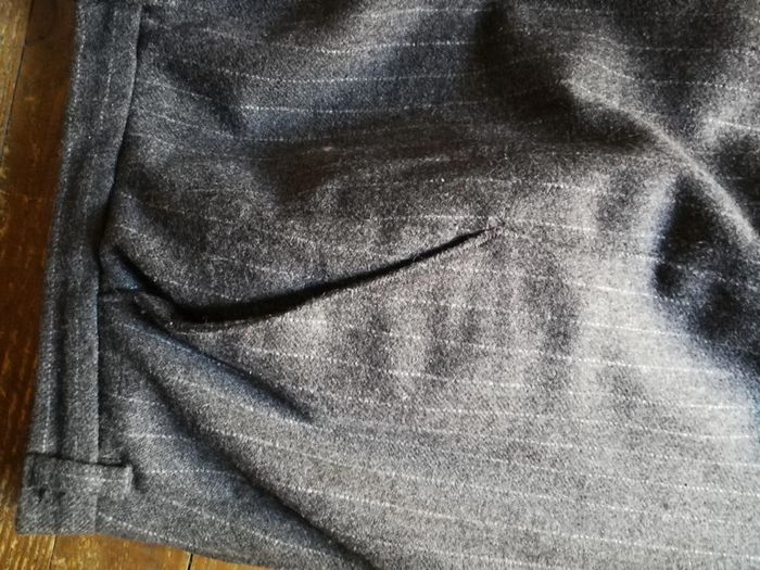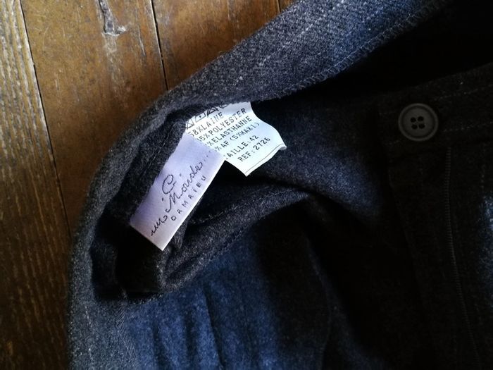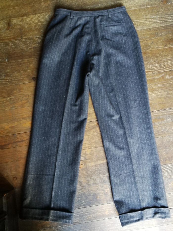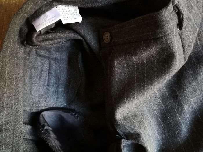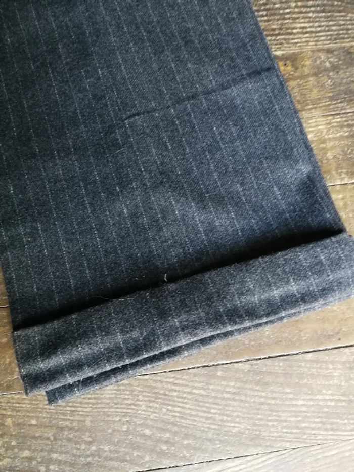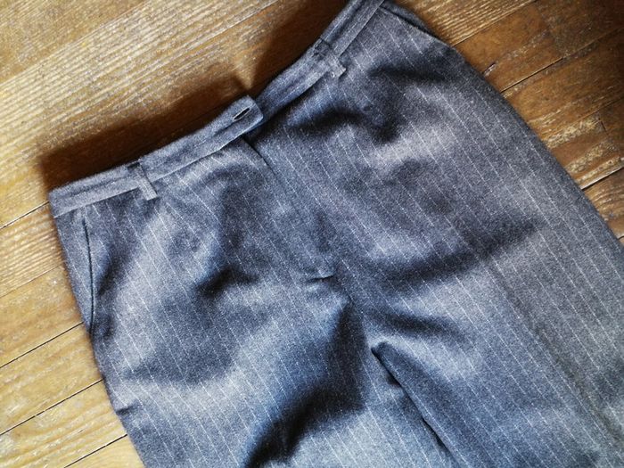 Pantalon gris à rayures classique, pour femme, en laine Camaieu, taille 42, composition 58% laine, 35% polyester, 2% élasthanne, 5% AF (5% maxi), Camaieau, étiquette vintage, pantalon vintage. Pantalon droit avec revers,avec les pinces à la taille, la braguette et le bouton sur la ceinture, deux poches sur les côtés et une aux fesses. Consulter les mesures pour être sûre que c'est votre taille. Le pantalon est en très bon état, juste le bouton à décourdre et recoudre à la bonne place. Mesures : Longueur depuis l'entrejambe: 72 cm Largeur cheville à plat : 25 cm Longueur devant entrejambe : 31 cm Tour entrejambe : 66,5 cm Tour de taille : 76 cm Poids : 375 g #pantalonfemme #pantalonvintage #pantalonclassique #pantalongrisrayures #pantalondecostume