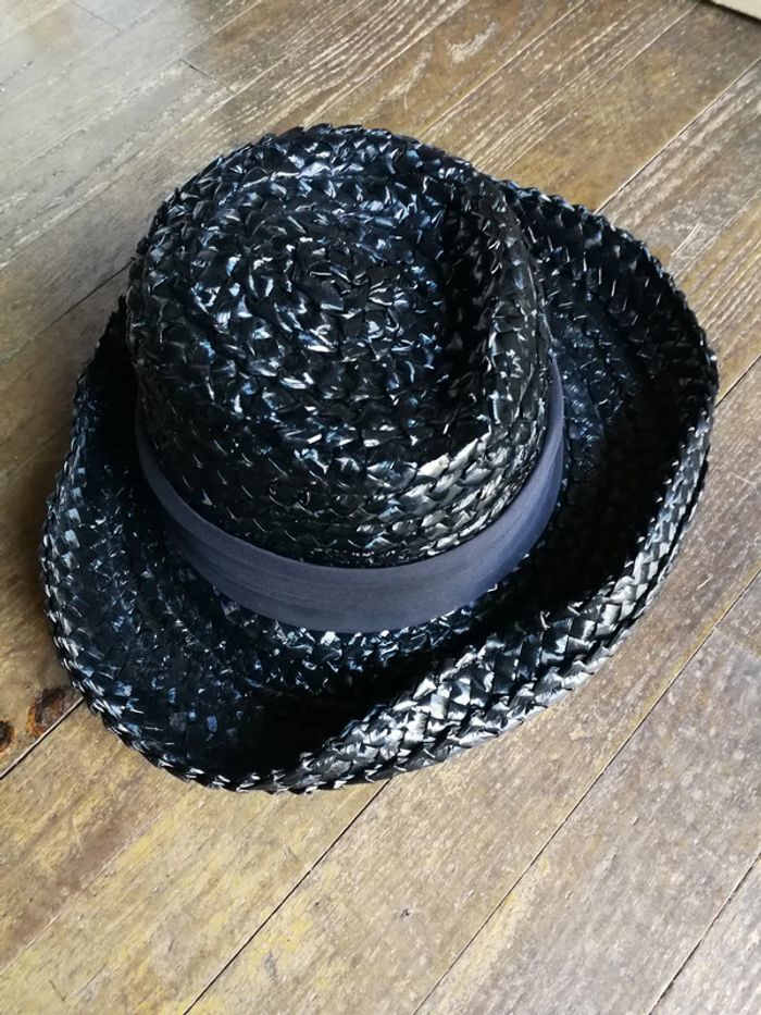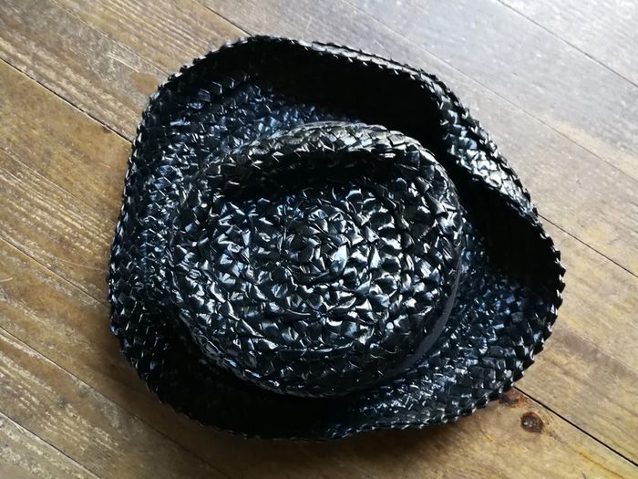 Chapeau de paille brillant vernis, en très bon état, petite taille, assez haut. Consultez les mesures ci dessous : Hauteur : 11 cm Diamètre intérieur : 18 cm Tour de tête : 54 cm Largeur : 37 cm Poids : 87 g #chapeaunoir #chapeaudepaille #chapeau #chapeaubrillant