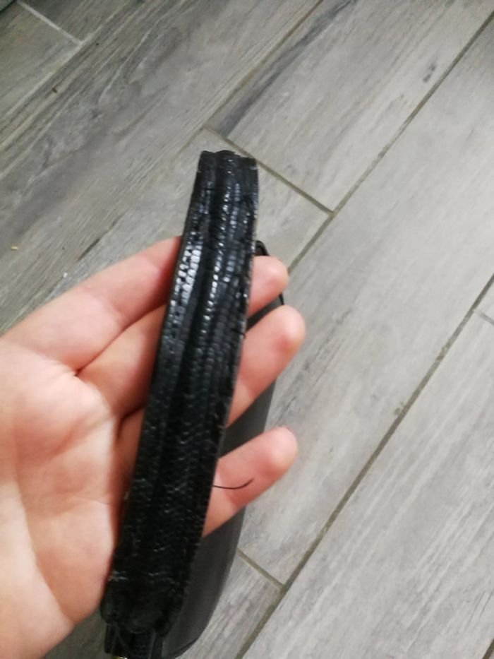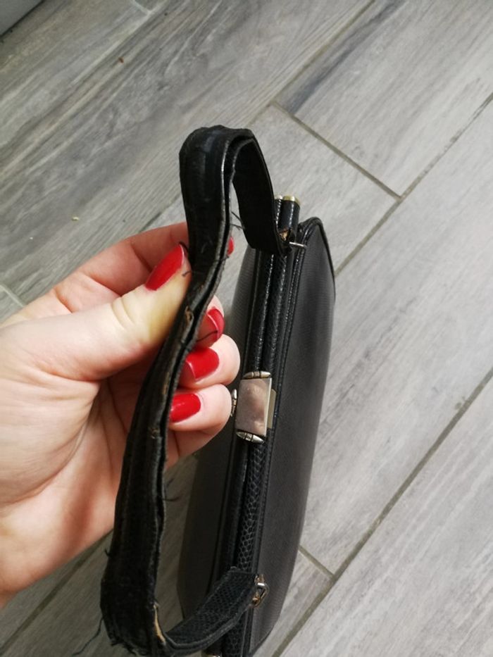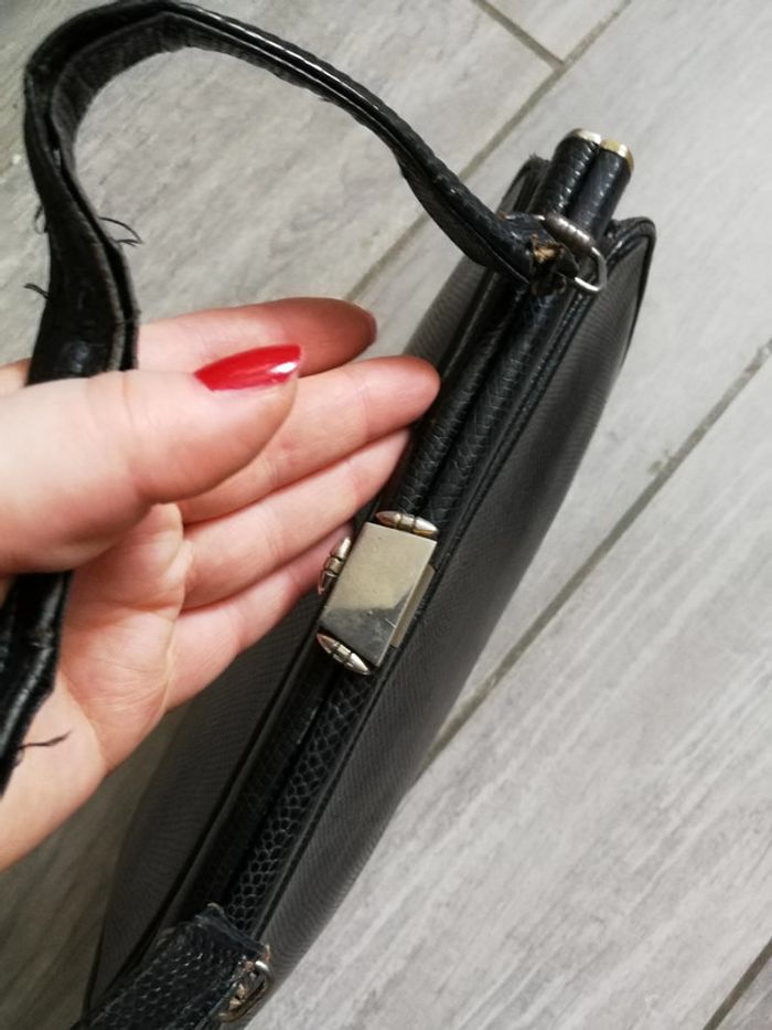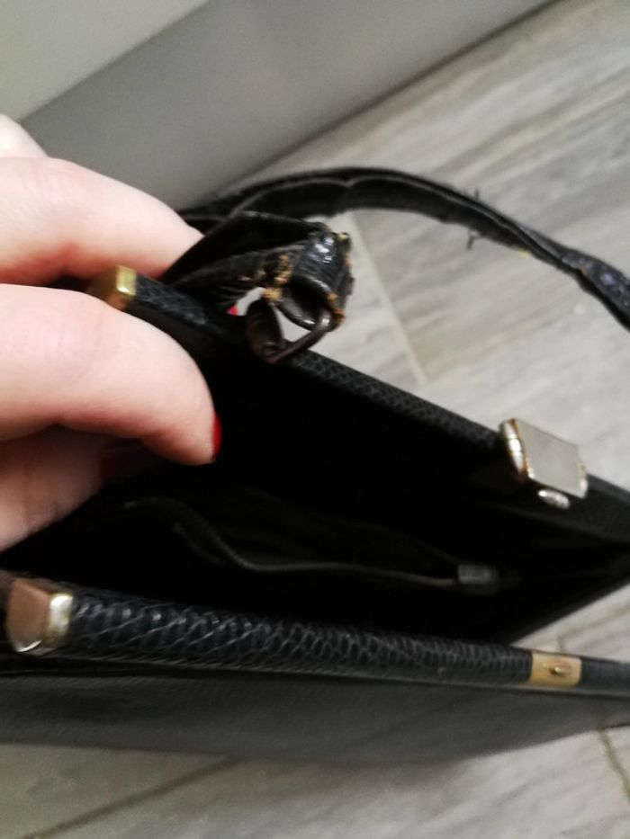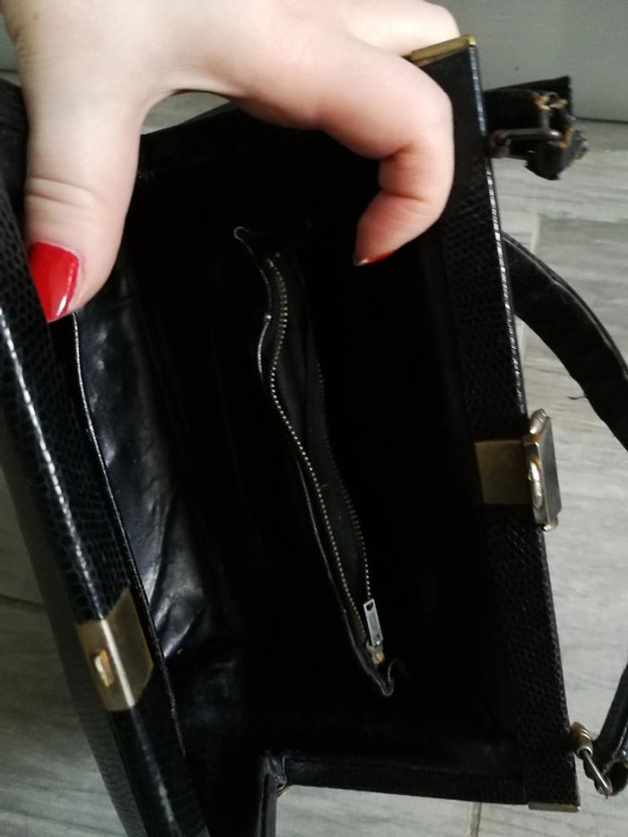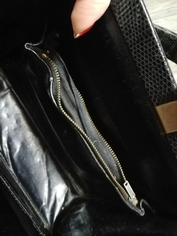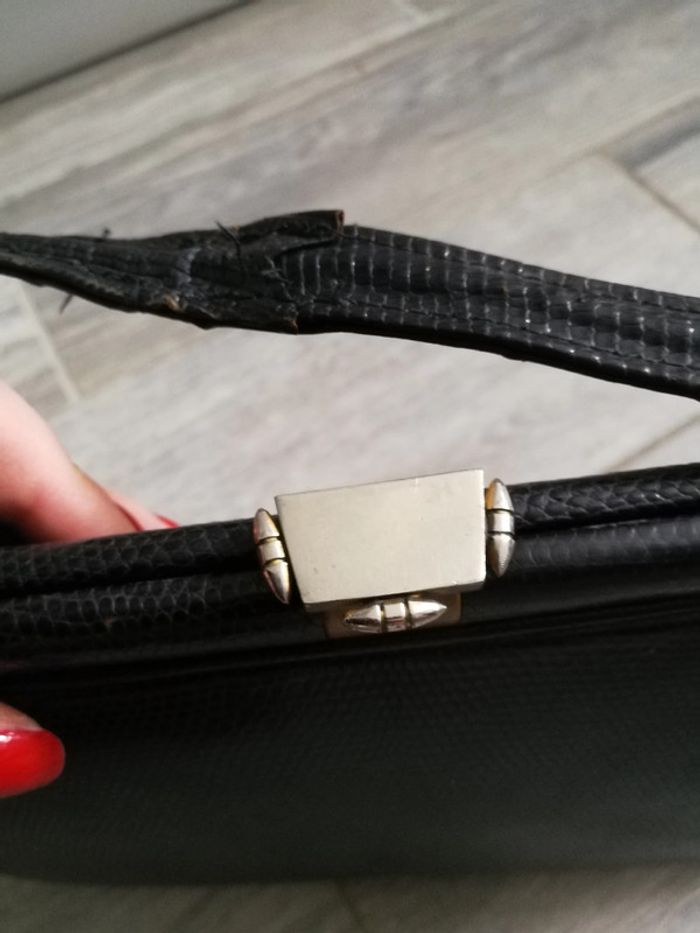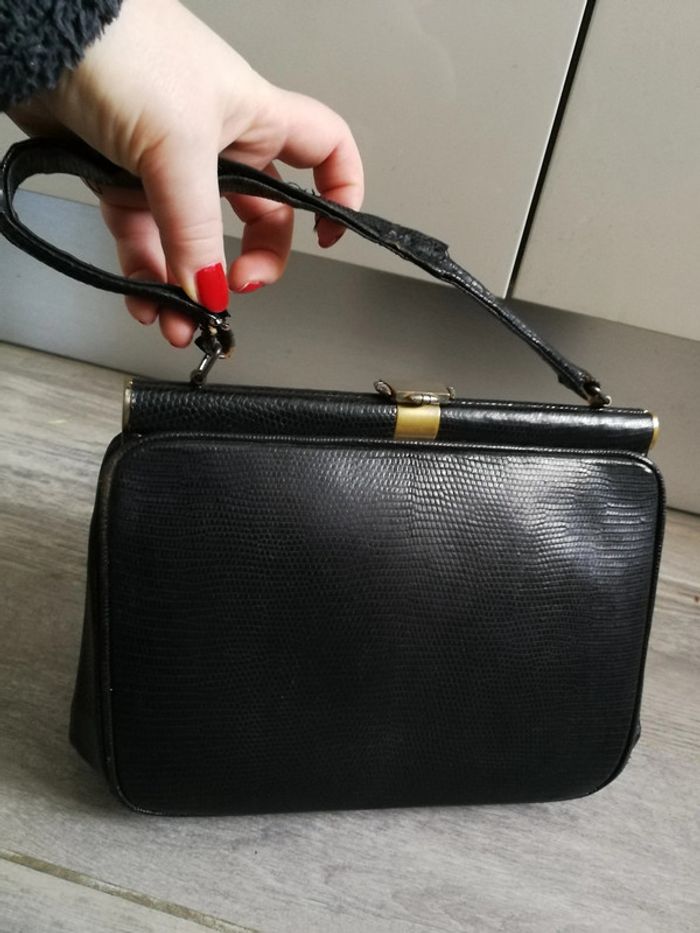 Sac à main ancien type porte-monnaie en similicuir noir style réptile. Sac à main vintage retro probablement des années 1950-1960, je ne suis pas sûre. Joli objet de collection, avec la poignée souffrante, elle est très marquée par le temps, le sac se ferme par clip et a été nettoyé et nourrit par la crème, les pièces métalliques du sac autre fois été dorées désormais ils sont argentées, la dorrure est partie avec l'époque. L'extérieur est en bon état général, le fermoir est fonctionnel, l'intérieur est pléstifié en état satisfaisant, avec une poche à zip vielli, mais fonctionne et deux poches simples. Bel objet d'époque, excellent pour compléter la collection ou une sortie déguisée.