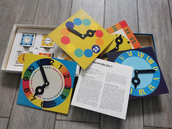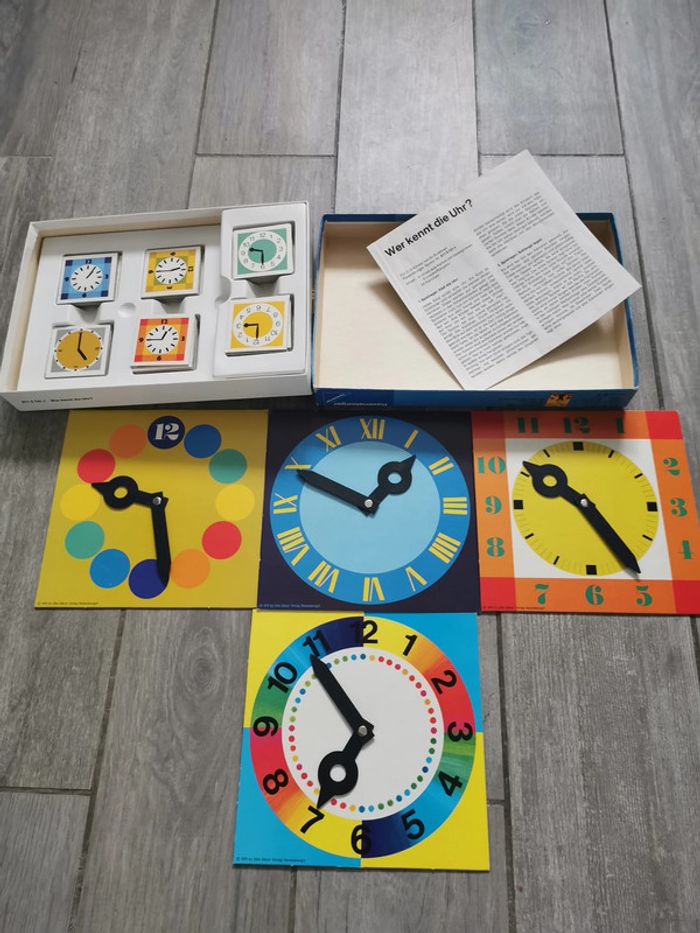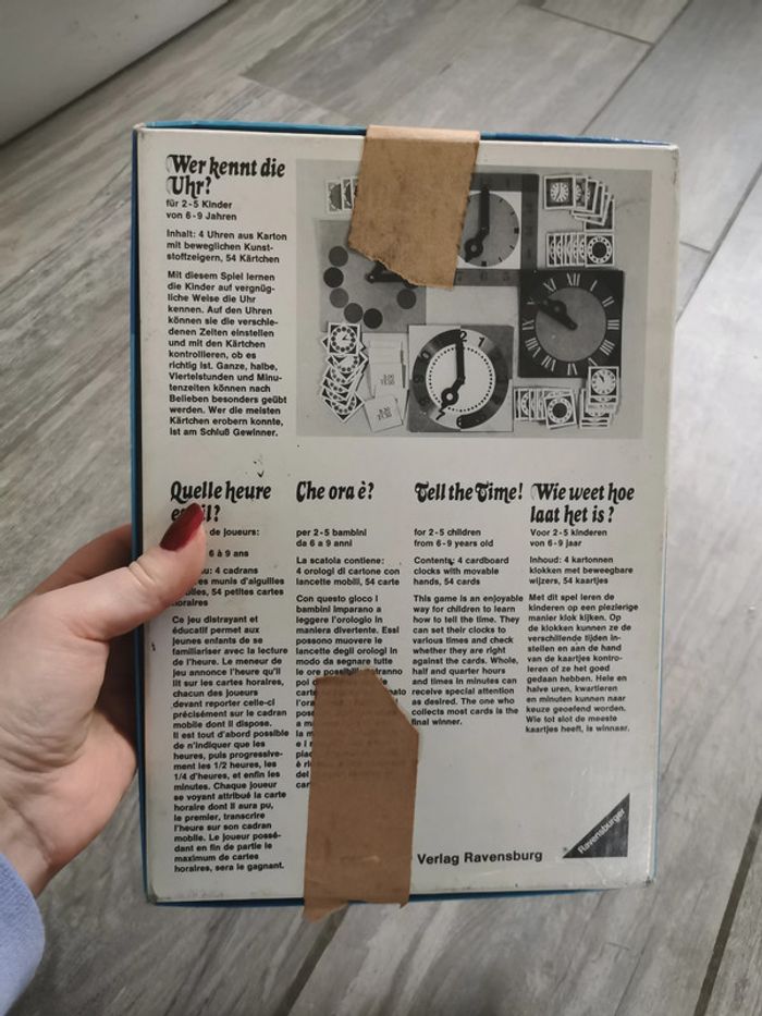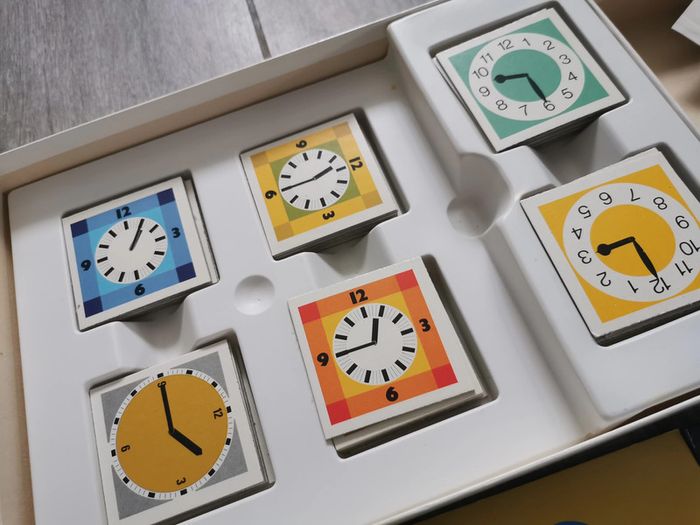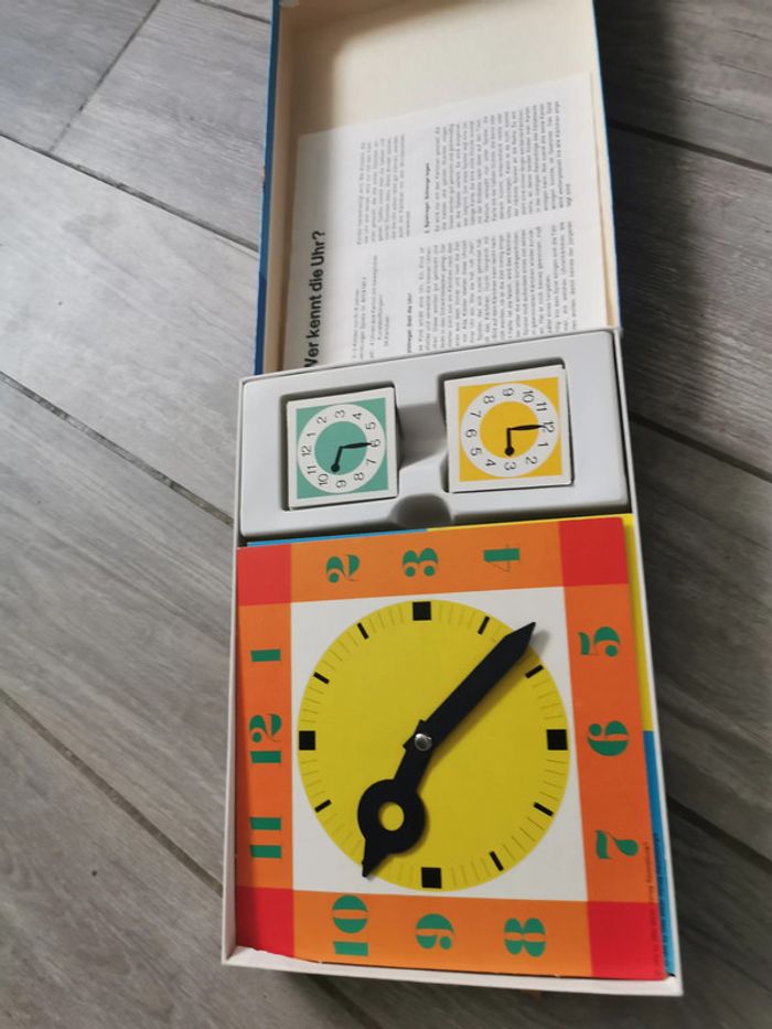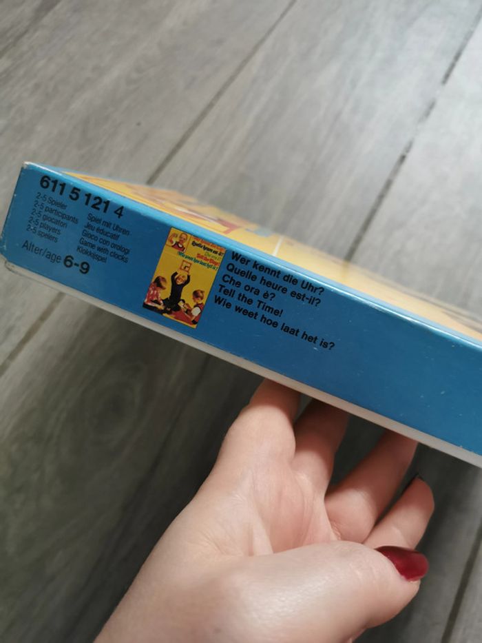 Jeu Ravensburger Quelle heure est-il ? Année 1975, fabriqué en Western Germany, pour 6-9 ans, pour 2 à 5 joueurs, référence 611 5 11 4 . Le jeu est en très bon état, ancien, comme neuf, la boîte est un peu marqué, pour son âge, elle reste en bon état, abîmée sur les côtés par le vieux scotch, que je n'ose pas à décoller car colle très fortement. Les cartes de jeu et les horloges sont en carton rigide et en très bon état, avec les instructions. Dimensions da la boîte : Longueur : 27,5 cm Largeur : 19,5 cm Hauteur : 3,5 cm Poids : 470 g #jeuravensburger #jeuhorloge #jeutemps #quelleheureestil #jeuancien #jeuvintage #jeucollection #jeuwesterngermany #jeu1975 #jeueducatif #jeu6ans #jeu9ans #jeu7ans #jeu8ans