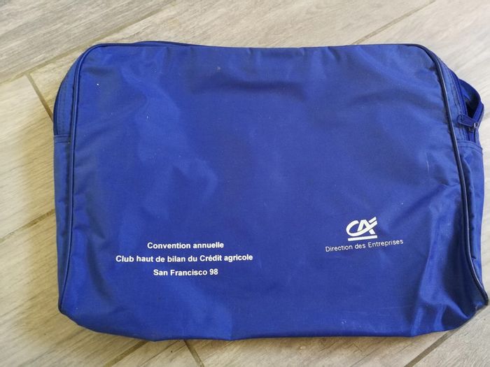 Pochette bleu à zip Crédit Agricole, en très bon état. La pochette est en matière imperméable, avec la poignée au dessus. Dimensions : Largeur : 38 cm Hauteur : 27 cm Profondeur : 6 cm Poids : 130 g #pochetteblu #pochetteàzip #sacochebleu #sacochepapiers #sacocheàzip