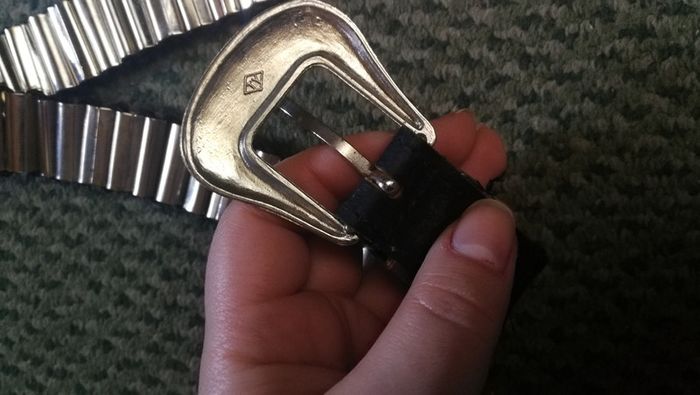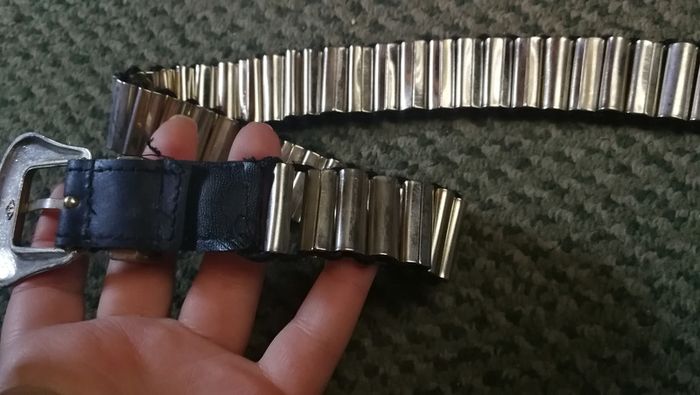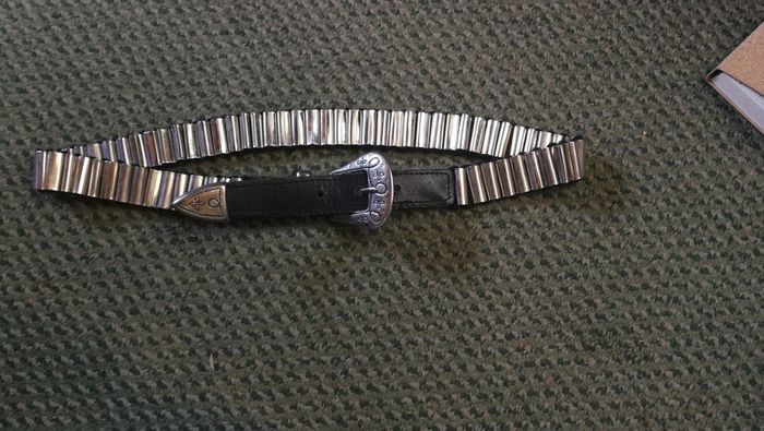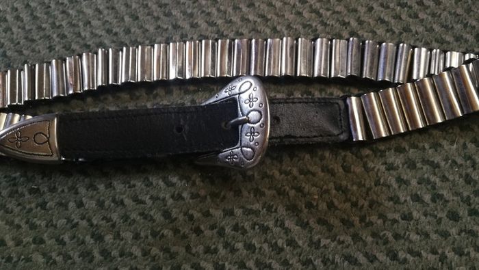 Ceinture en métal argenté munitions avec boucle western. Ceinture tendance avec la boucle, passant et bout mexicaines style western, en métal argenté type munitions et le simili cuir noir. La ceinture taille 70 cm, elle est assez lourde 300 g. Belle pièce originale, occasion, en bon état. A l'intérieur de la boucle inscription TY. Mesures : Largeur : 2,5 cm Longueur : 70 cm Épaisseur : 0,5 cm Poids : 300 g #ceintureoriginale #ceinturemétal #ceintureminutions #ceinturevintage #ceinturebouclemexicaine #ceintureboutmétal #ceinture70cm