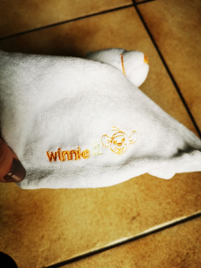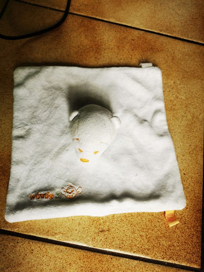 Doudou Winnie ours blanc , bon état général, la couleur a un peu ternie. La taille du carré fait 20x20 cm, son poids 45 g #doudouoursblanc #doudoucarré #doudouours #doudouwinnie #peluchebebe #pelucheours