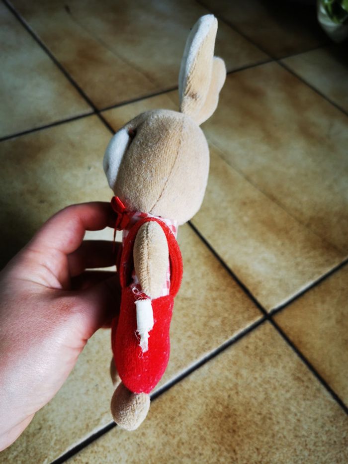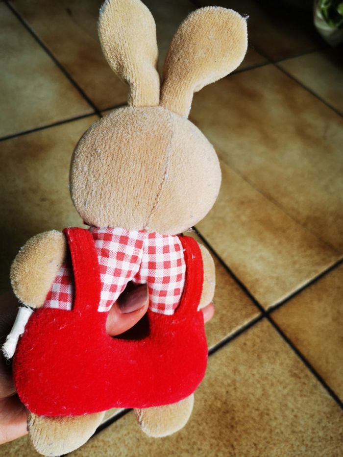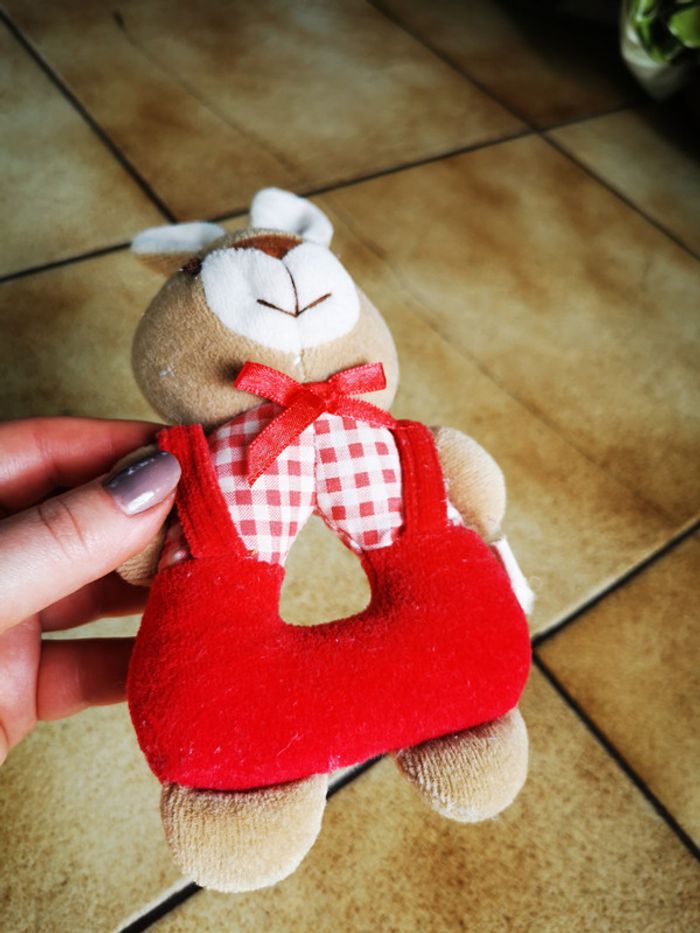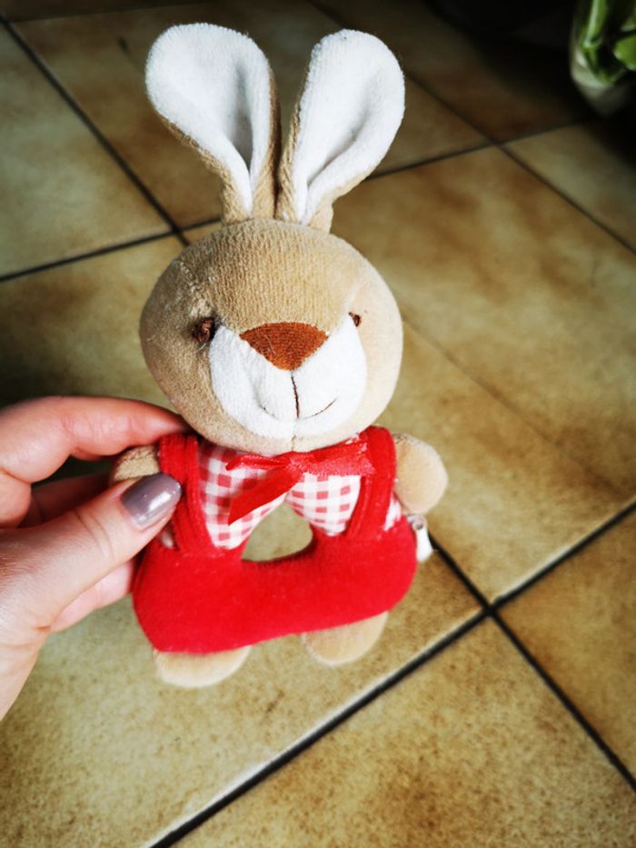 Doudou lapin hochet H20 x L9cm, poids 41 g, en très bon état. Petit lapin en salopette rouge et une chemise à carreaux rouge et blanc avec un nœud papillon rouge, la marque Simpson traiding. #simpsontraiding #lapinhochet #hochet #doudoubebe #doudoulapin #doudouhochet