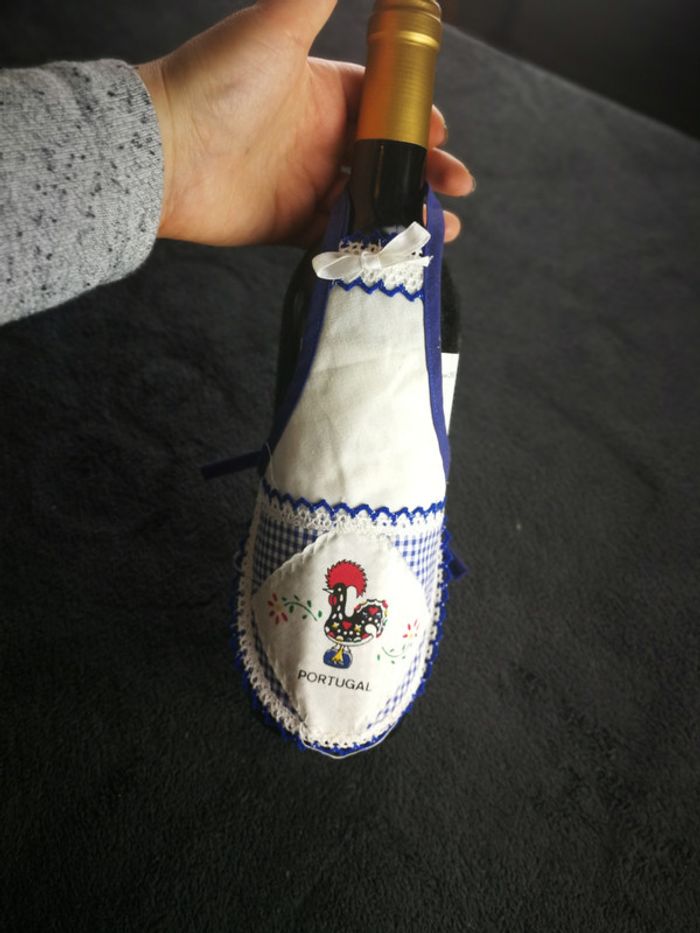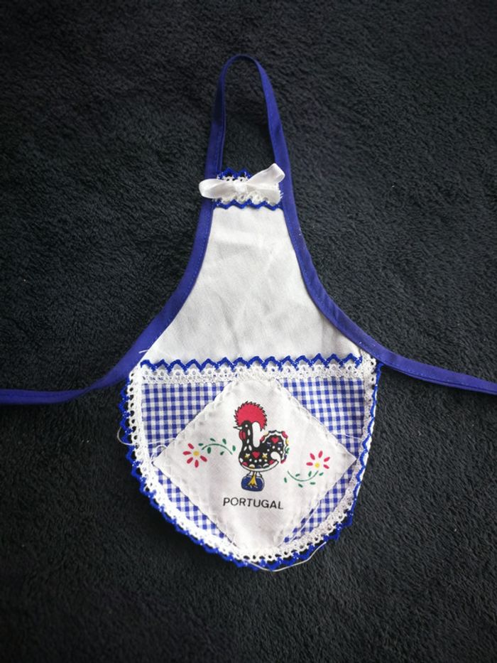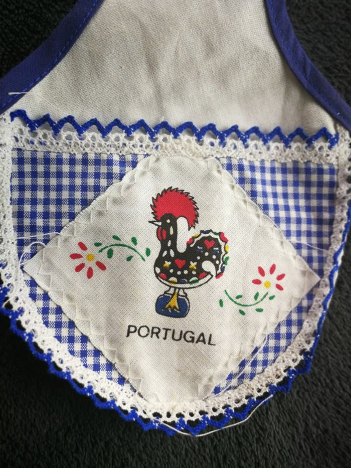 Tablier pour la bouteille hauteur total 26 cm avec la boucle, largeur 13,5 cm + les ficelles, fabriqué au Portugal, avec inscription Portugal, occasion, quelques fils sont sortis, bon état général. #tablierpoupée #tablierbouteille #tablierportugal #decorationportugal #decoclairecamay