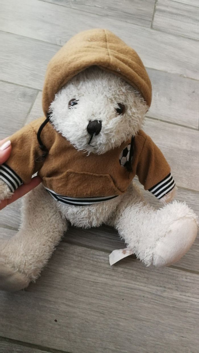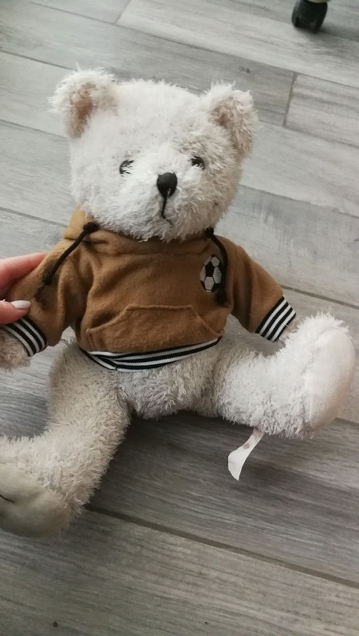 Peluche ours blanc dans le sweat, bon état général. Ours blanc dans le sweat à capuche. Mesures : 25 x 20 cm, poids 250 gr #pelucheours #ourspeluche #ourspull #ourshabille