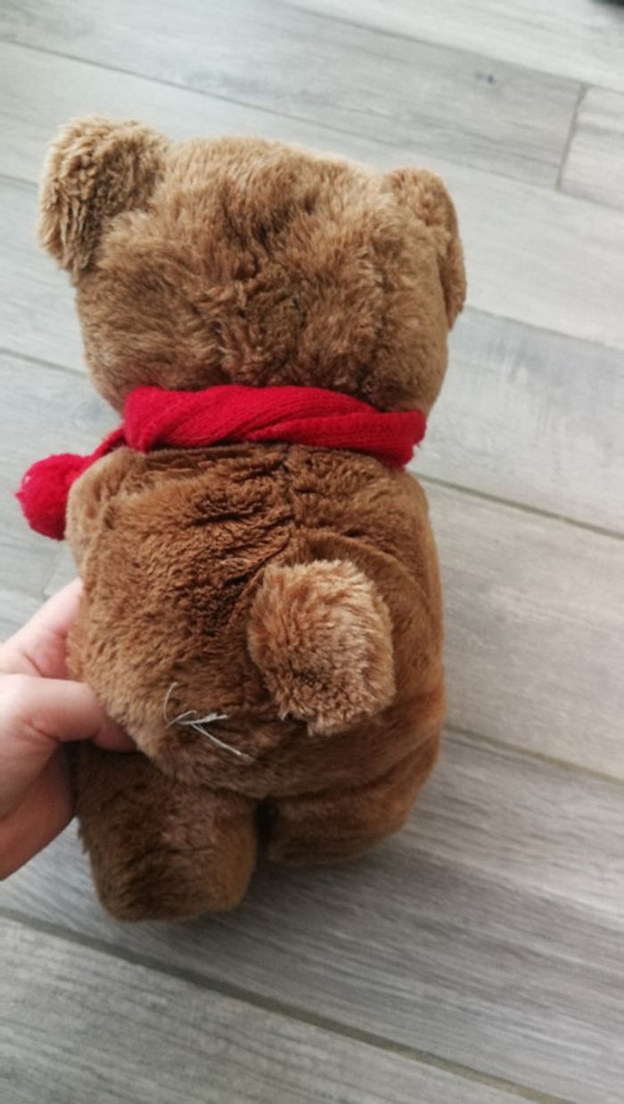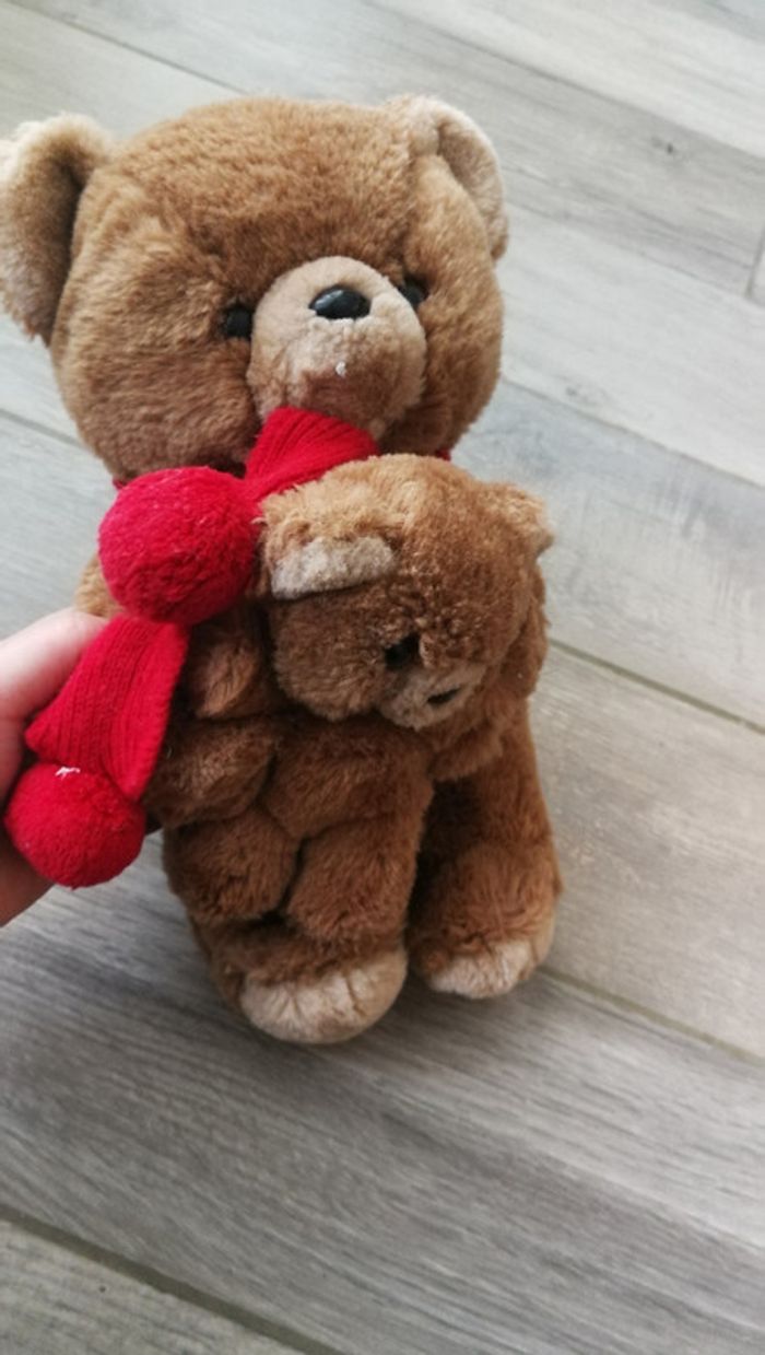 Peluche ours maman et bébé avec l'écharpe rouge. Peluches en très bon état, sont très doux. Mesures 32 x 16 cm, poids 300 gr #pelucheclairecamay #pelucheours #pelucheourson #bebeclairecamay #enfantclairecamay