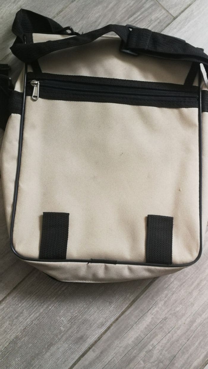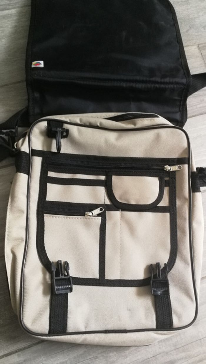 Sacoche beige avec 1 bandoulière AIPCR 2003 PIARC. Bon état général, mis à part quelques taches devant et un des crochets décolorés, la deuxième bandoulière est absente mais vous avez des crochets au dos pour y accrocher les poignets pour le porter comme sac à dos. Fermeture devant par des crochet, une poche à zip devant, une poche à zip derrière, porte étiquette nom devant, une attache devant, une grosse poche sans zip devant sous le couvercle et sur cette même poche plein de petites poches simples ou à zip ou à scratch. L'intérieur simple sans poche, idéal pour le format A4, transporter des documents ou des cahiers, cours, livres. On peut également élargir à 13 cm le sac en ouvrant le zip. Mesures : H35 x L28 x P7 (13) cm, poids 800 gr #sacclairecamay #sacbandoulière #sacbeige #tissu