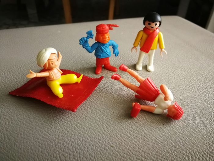 Figurines en plastique Aladdin (année 1978) + 3 bonhommes : 1 personnage playmobil (année 1981), 1 personnage indien, 1 personnage fille style playmobil, il lui manque une partie de jupe derrière. Bon état général, poids 25 gr #figurine #aladdin #bonhomme #playmobil #enfantclairecamay #collectionclairecamay #petitprix #5eurosclairecamay