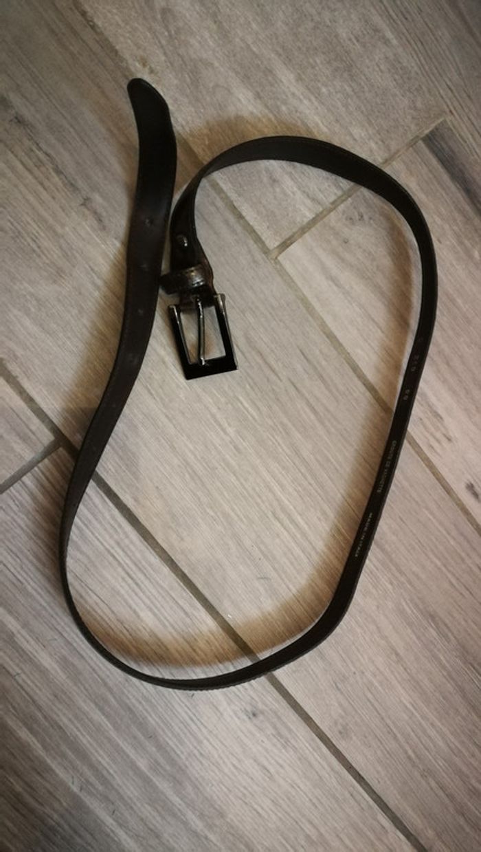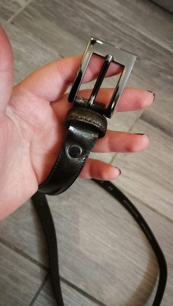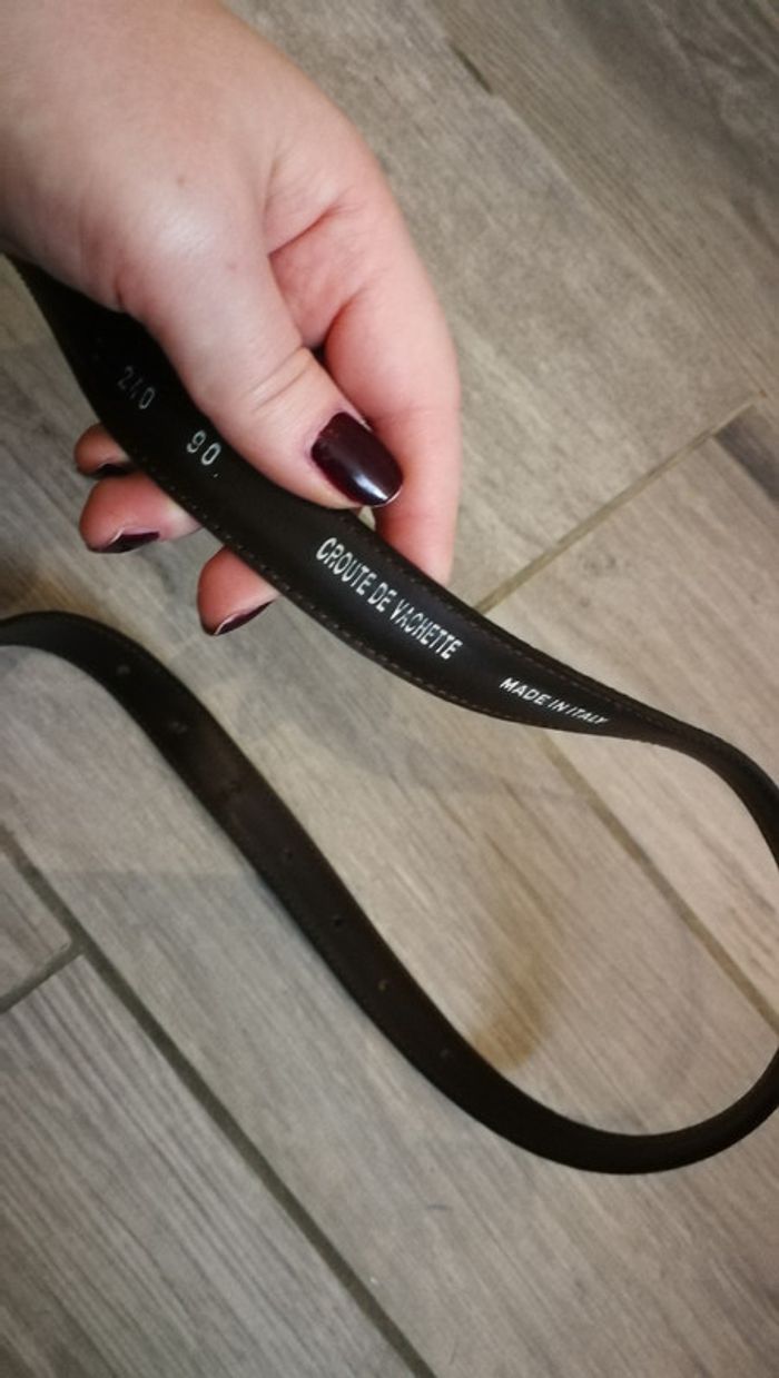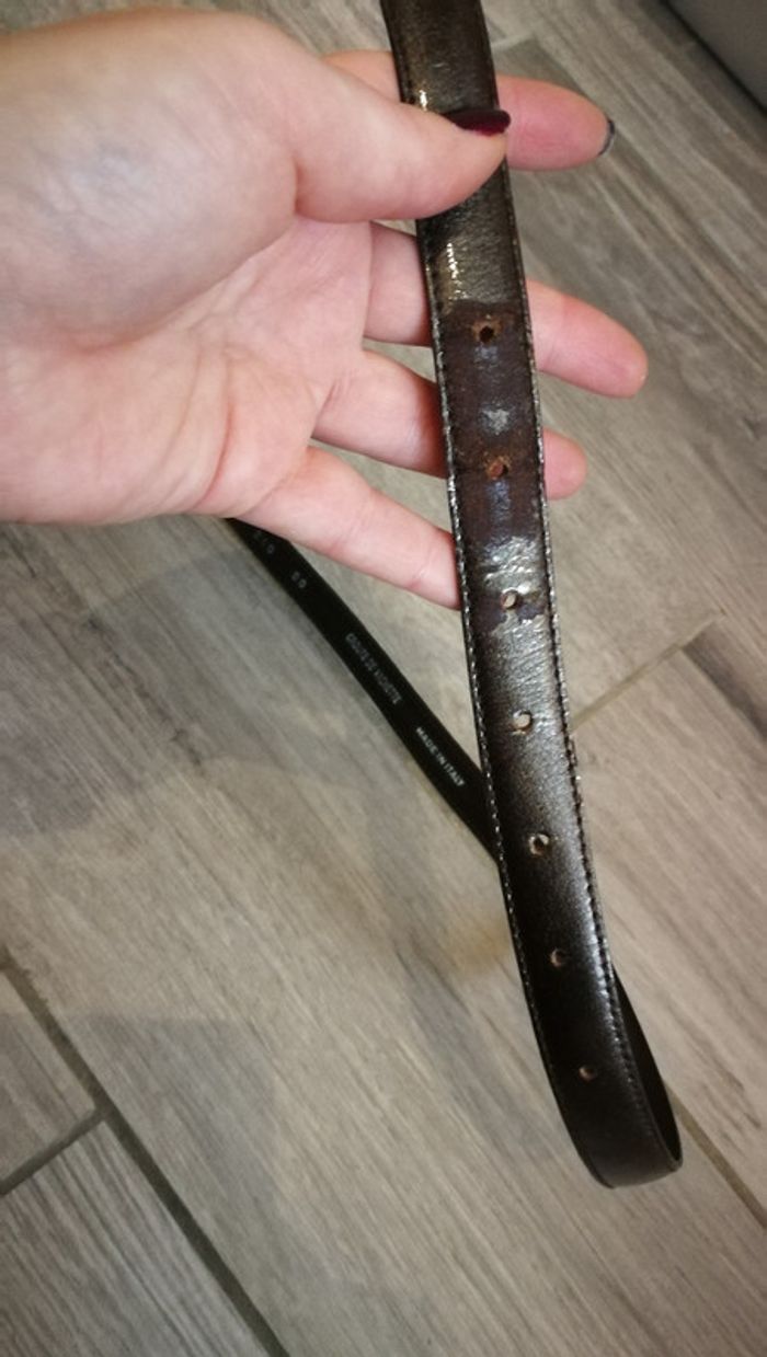 Ceinture en croûte de vachette laqué, fait en Italie, couleur marron, un peu usée au niveau des trous et au niveau de l'attache de boucle, la boucle est de couleur gris anthracite. La longueur de ceinture boucle compris fait 95 cm, la largeur 2 cm, le poids 70g #ceinture #ceinturecroutedevachette #ceinturelaqué #ceinturemarron #ceinturefine #centurepetitprix