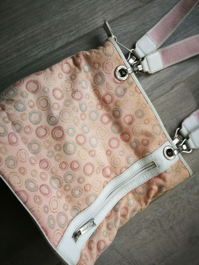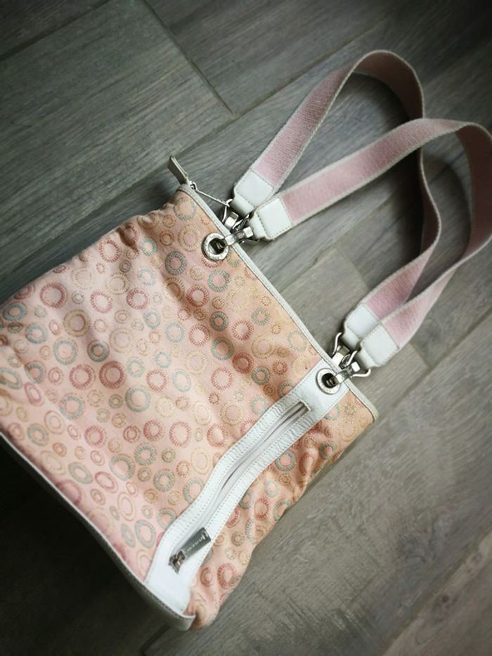 Sac à main rose en tissu Lancaster. Occasion, les parties en similicuir sont un peu usées, le tissu demande du nettoyage, l'intérieur est propre. Dimensions : H 25 x L 27 x P 10 cm, poignées 57 cm de long. Le sac a deux poches extérieurs une devant, une derriere et à l'intérieur une poche à zip, deux petites poches sans fermeture. #saclancaster #sactissu #sacamain #sacamainàmotifs #sacrose #sacenfant