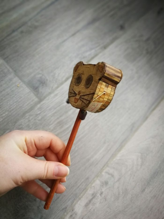 Tambourin chat occasion, une perle à l'extrémité de la ficelle est cassé et a été réparé avec du scotch. Il fait 18 cm de long et la tête de chat 6,5 cm de large, 5 cm de hauteur et 2,5 cm d’épaisseur. #tambourin #tambourin #jouet #jouet #chat #bambou #bebeclairecamay #enfantclairecamay #jouetbambou #jouetvintage