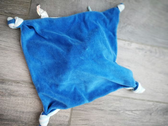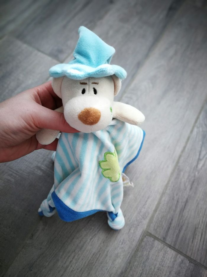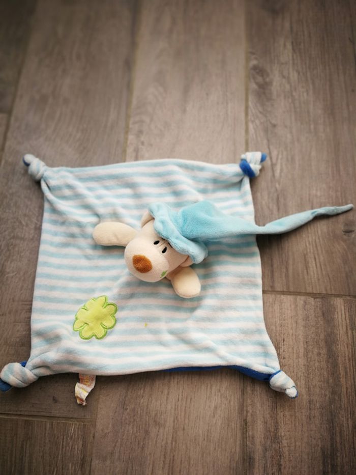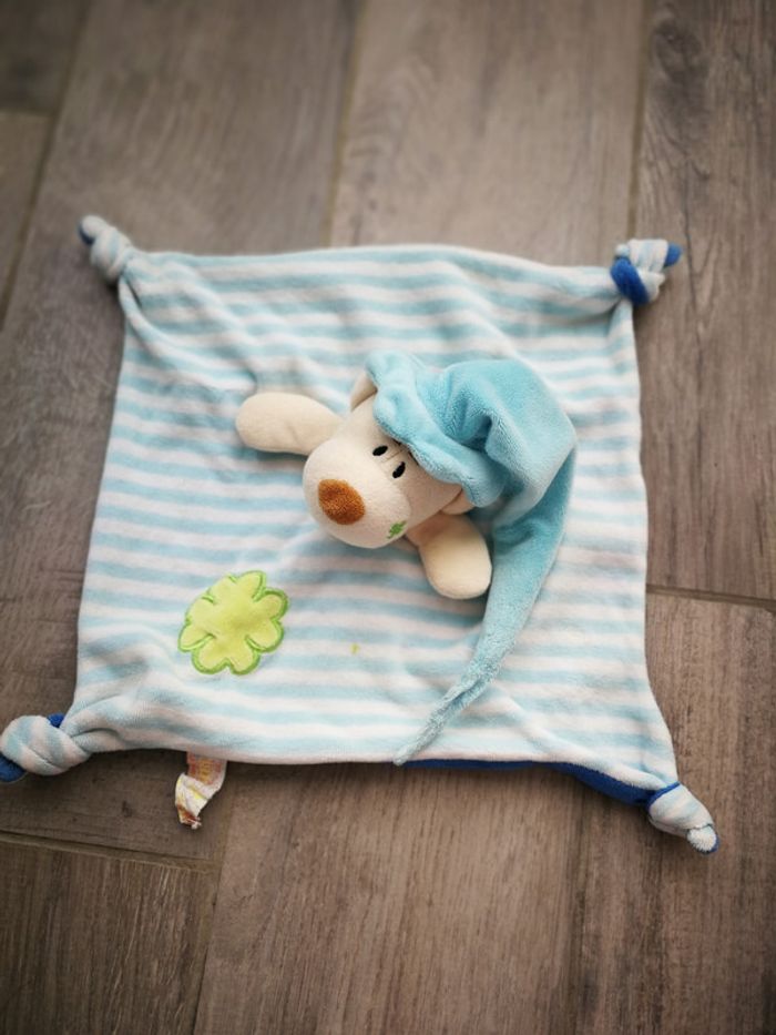 Doudou bleu chien avec un bonnet, un carré de 24 cm, 70 % coton, 30% polyester. Occasion, bon état général, deux petites taches à peine visibles. #doudouchien #doudoucarré #doudoubleu #doudoubébé #petitprix