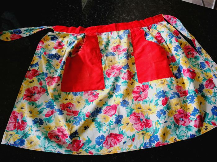Tablier rouge à fleurs en coton, occasion Tour de taille avec la ceinture 130 cm Largeur 76 cm Longueur 46 cm #tablier #jupe #rouge #poches #diversclairecamay #38clairecamay #3eurosclairecamay