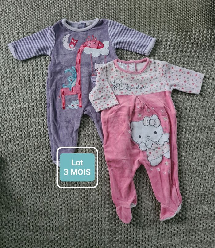 Lot de 2 pyjamas hiver fille en très bon état. - 1 violet motif animaux : Marque DPAM - taille 3 mois - 1 rose et blanc motif hello kitty : Marque SANRIO - taille 3 mois Envoi Rapide et Soigné J'applique une réduction si vous prenez plusieurs articles de mon dressing Photos supplémentaires possible sur demande.
