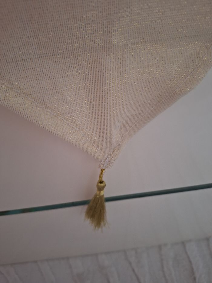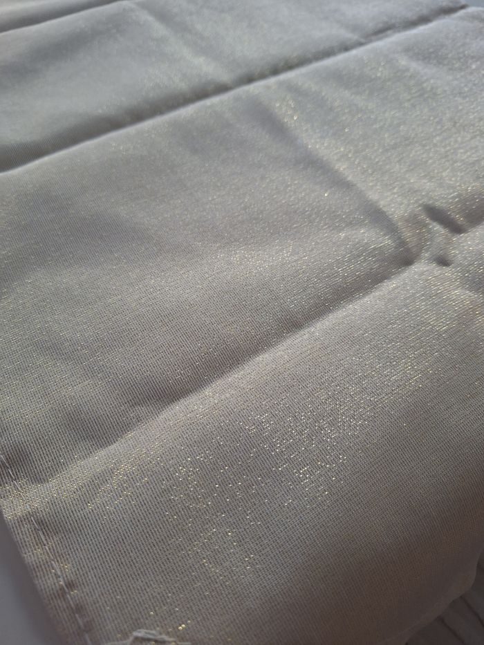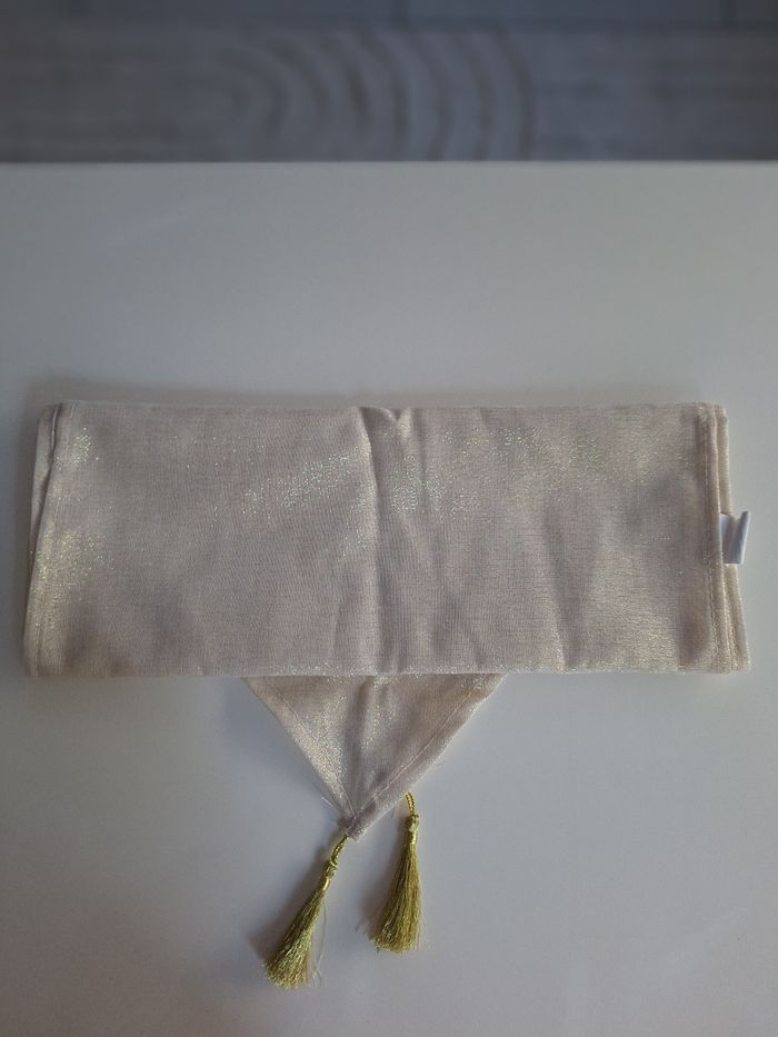 Bonjour ✴️Je vend ce chemin de table en très bon état utilisé 1 fois ✴️94% polyester et 6% fils métallisé doré ✴️Couleur beige et doré ✴️Mesurant 40x140cm ✴️De la marque B&M collection Karina Bailey ✴️Avec pompons dorés de chaque extrémités du chemin de table