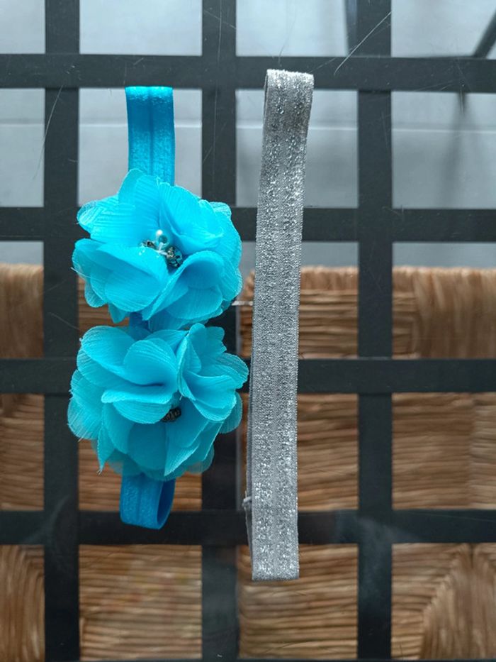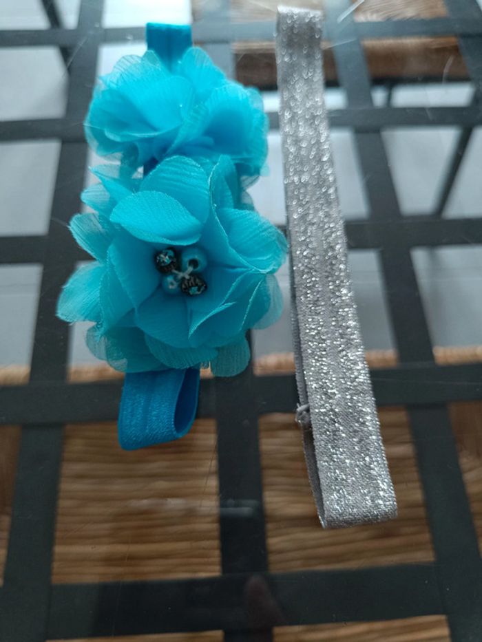 Bandeau bleu avec 2 fleurs. Bandeau gris à paillettes. #melody45340puericulture