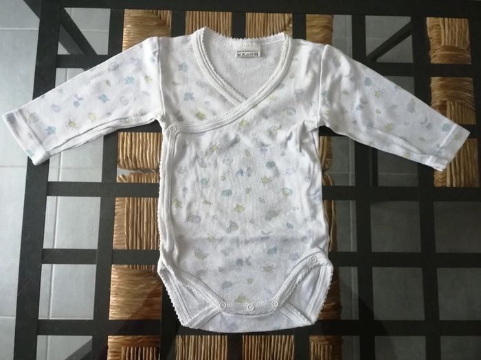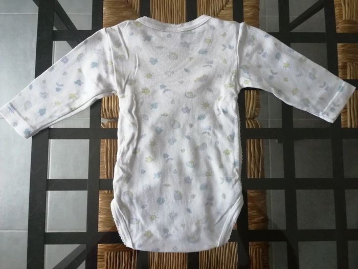 Manches longues. Article sans trou, ni tache. Abîmé au dessus d'une pression (photo). Dessin : soleil, tortue, feuilles, escargots, plante. #melody45340bebe1mois