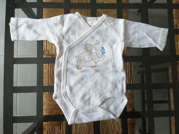 Manches longues. Article sans trou, ni tache. Dessin éléphant avec un oiseau. Inscription : tchip, tchip ! #melody45340bebenaissance